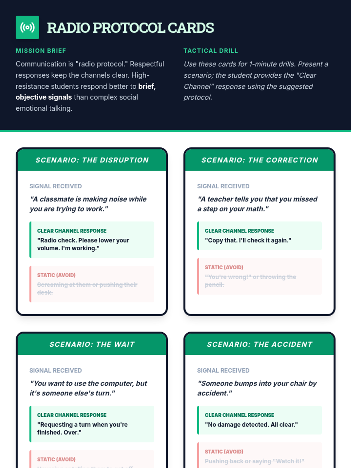 A set of tactical communication protocol cards helping students use respectful responses to common classroom triggers.