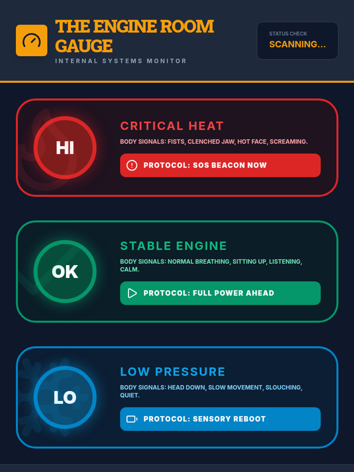 A chart to help students identify their body's signals of distress and choose appropriate strategies for self-regulation.