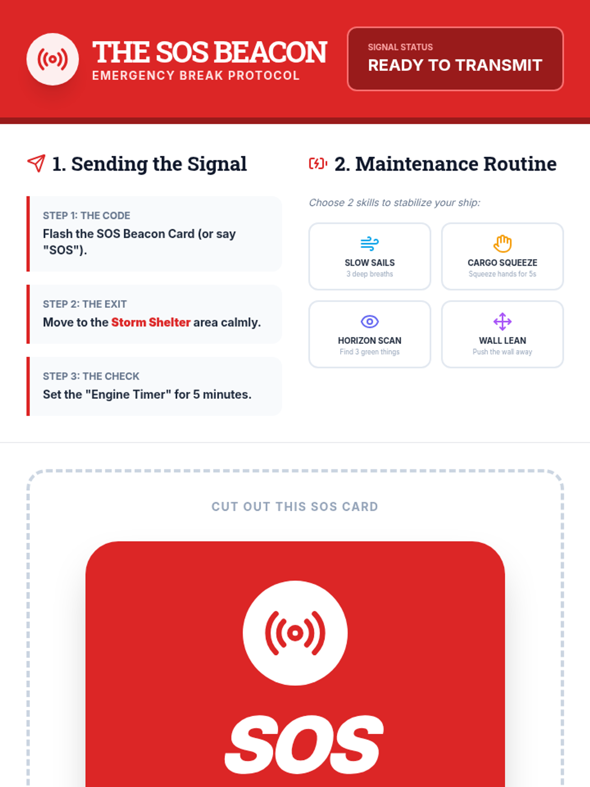 A visual and tactical tool for requesting and appropriately using a break, framed as an SOS Beacon for 'tactical reloading' rather than a behavioral intervention.
