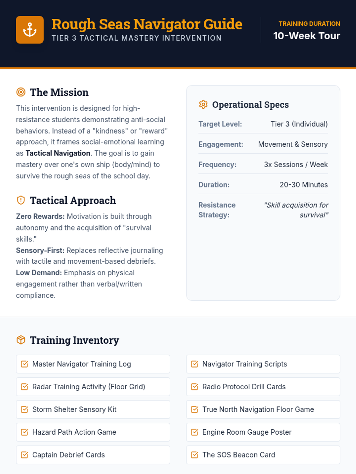 The updated comprehensive teacher guide for the 10-week Navigator Mastery intervention, shifting from a reward-based kindness theme to a movement-and-sensory survival skill framework for resistant students.