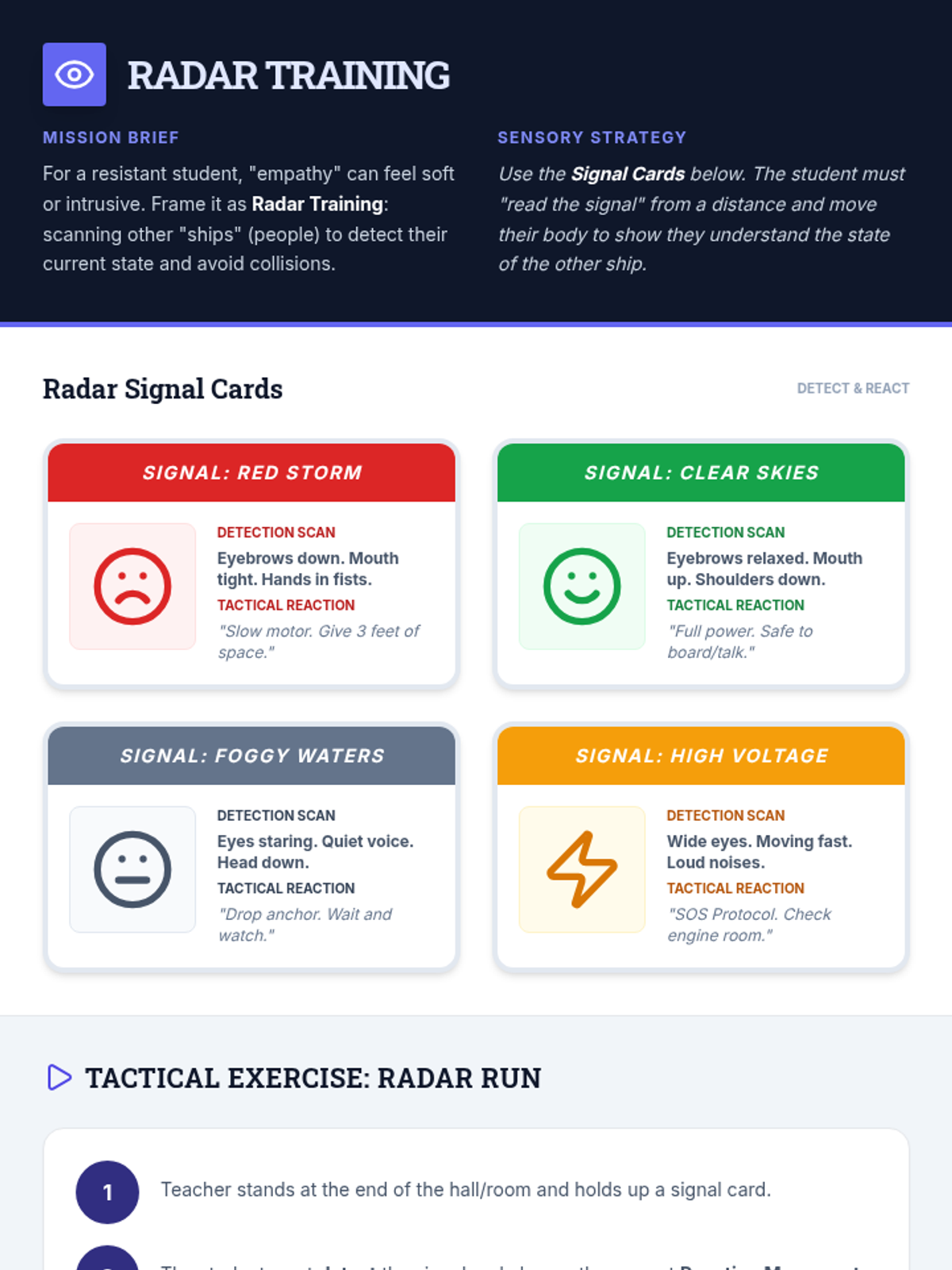 An activity guide for teaching social awareness (empathy) through 'Radar Training,' focusing on detecting emotional signals in others and choosing appropriate movement-based reactions.