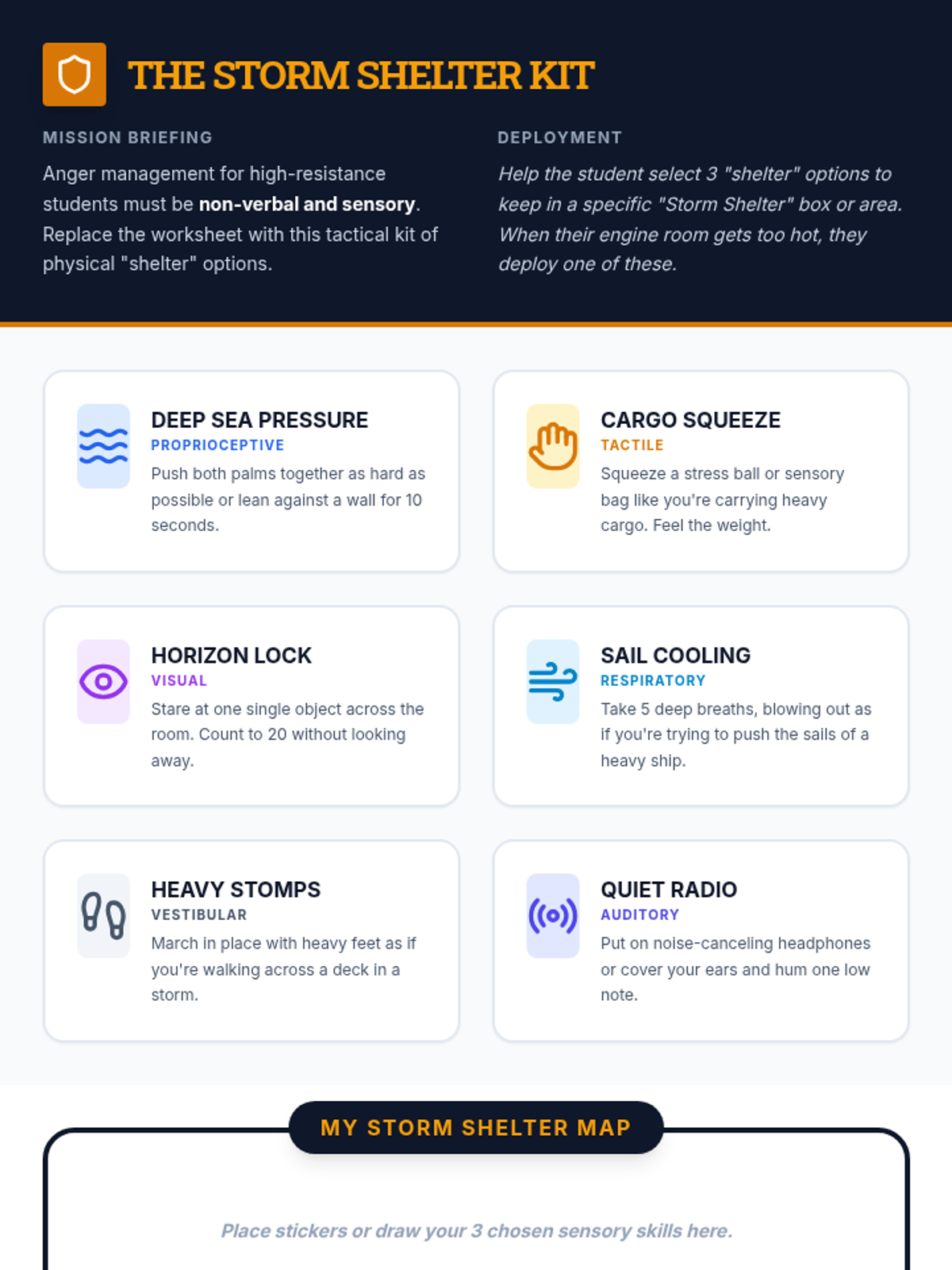 A sensory-based tool replacing the traditional anger management worksheet, offering tactile and proprioceptive strategies for self-regulation during high-stress moments.