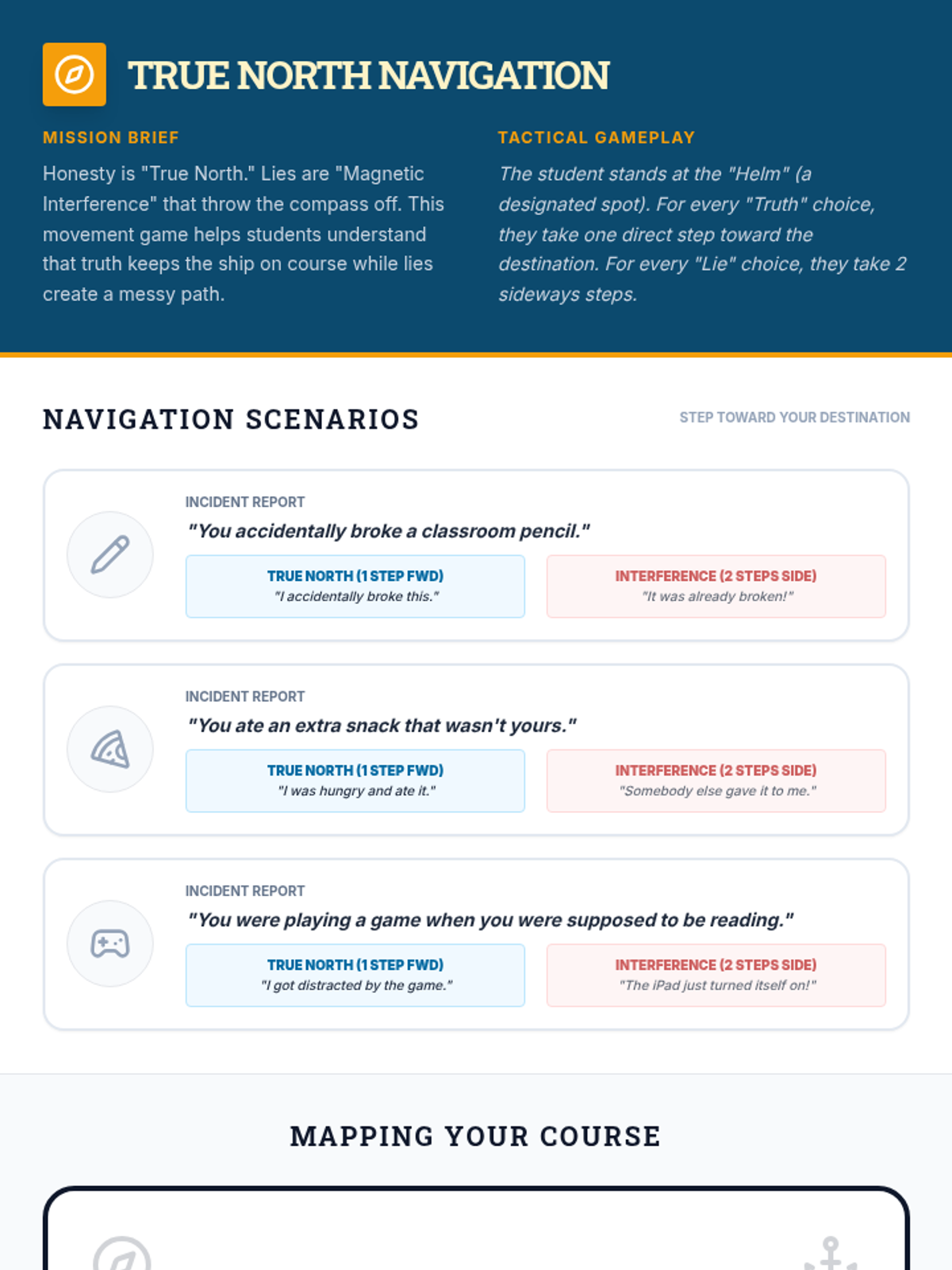 A movement-based game for teaching honesty, replacing the 'Honesty Heroes' journal. It frames truth as a direct course and lies as 'magnetic interference' that causes sideways movement.