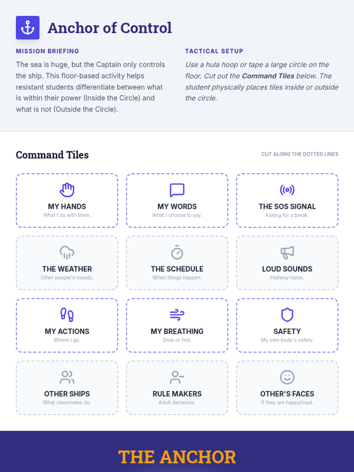 A movement-based floor activity for teaching the 'Circle of Control' concept, where students physically place tiles to differentiate between internal and external factors.