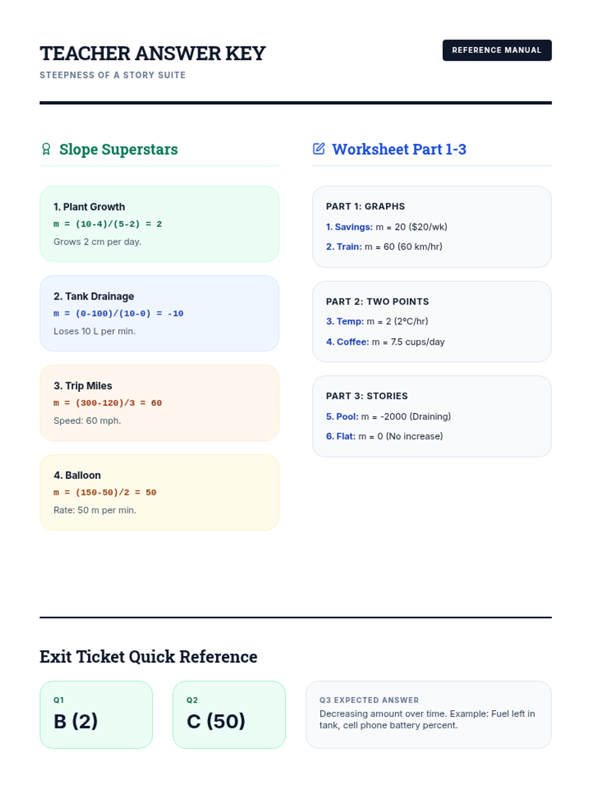 A comprehensive answer key for the Slope Superstars Activity, Rate of Change Worksheet, and Exit Ticket, designed for easy teacher reference with high contrast and clear sectioning.