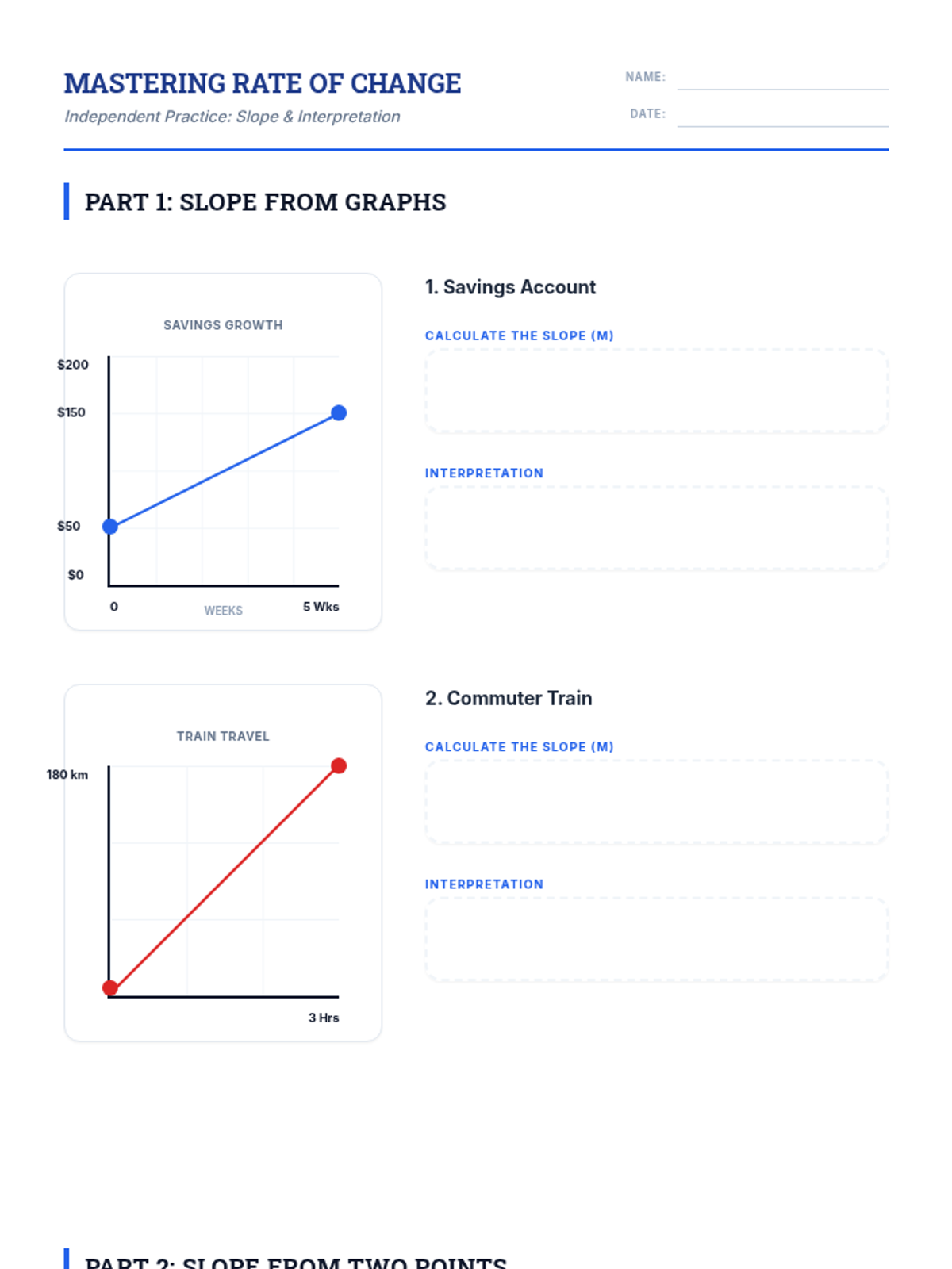 Independent practice worksheet for calculating and interpreting slope from graphs, points, and real-world scenarios, optimized for 8.5x11 printing with 1-inch margins.