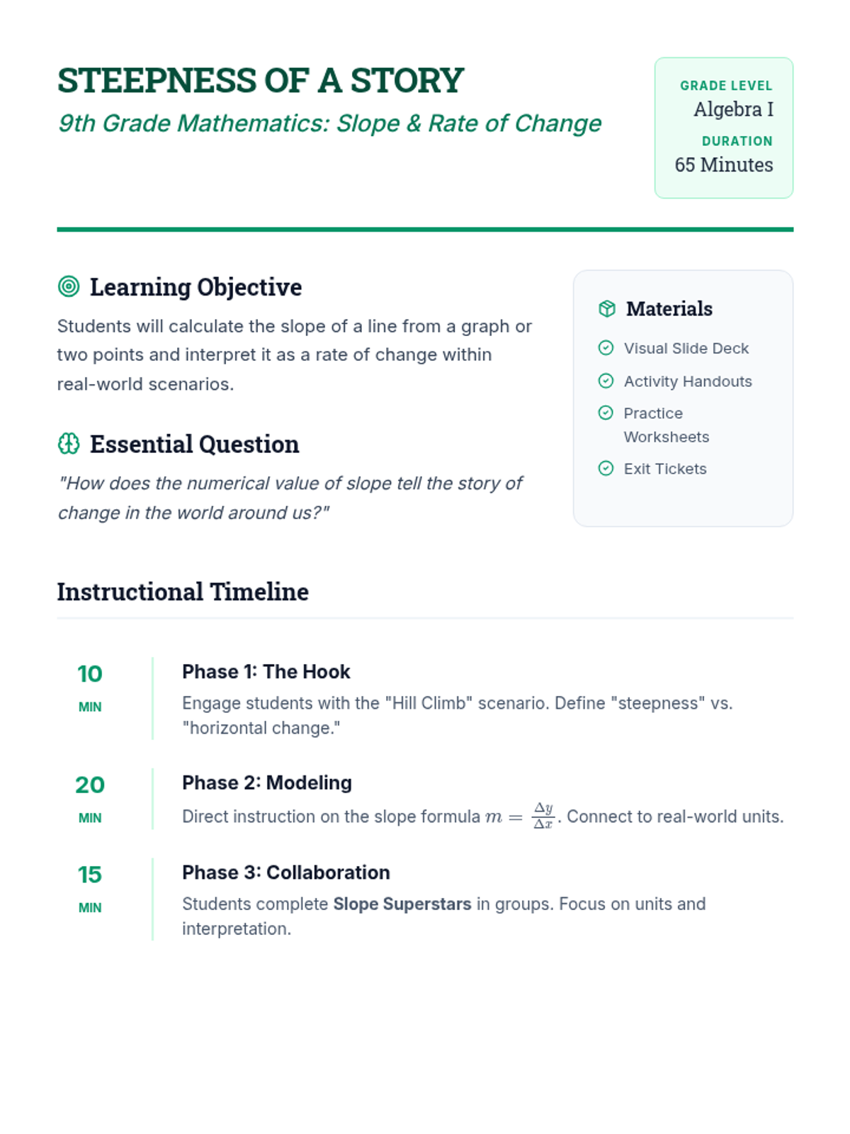 A professionally formatted 2-page lesson plan for 9th-grade math, optimized for 8.5x11 printing with 1-inch margins and clear instructional phases.