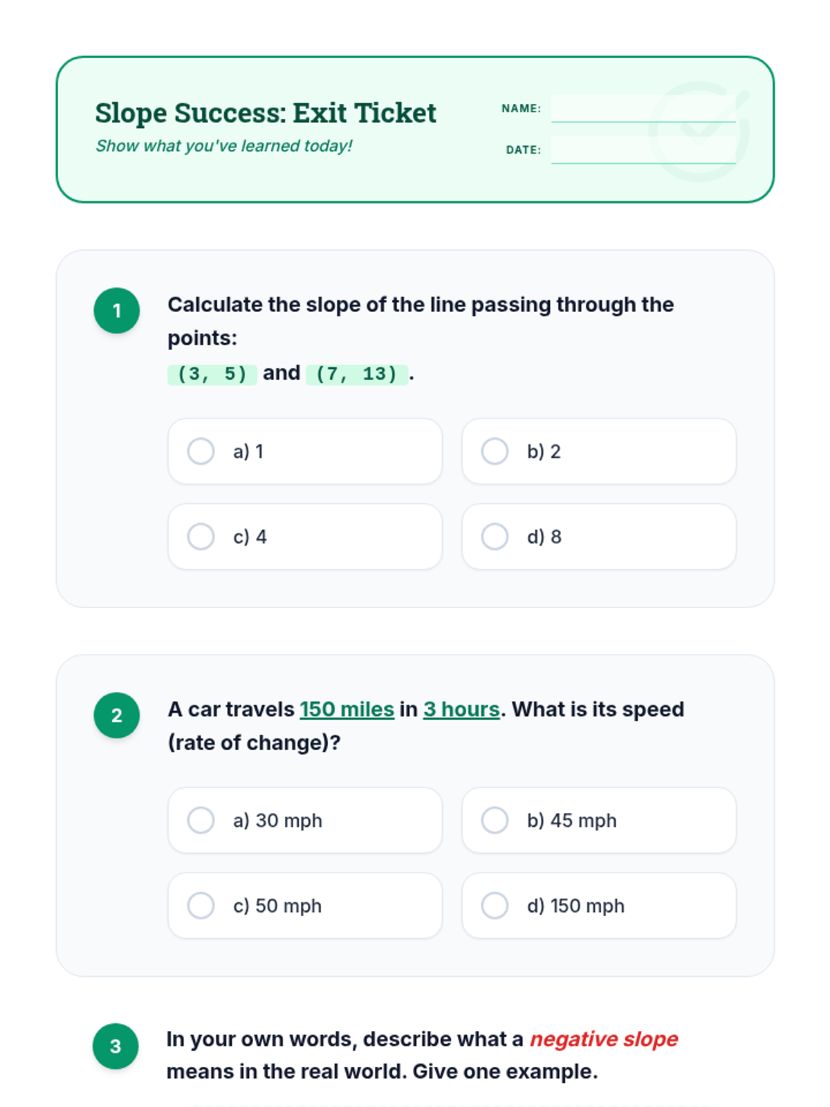 A short assessment to evaluate student understanding of calculating slope from points and interpreting its real-world meaning, optimized for 8.5x11 printing with clear work areas and 1-inch margins.