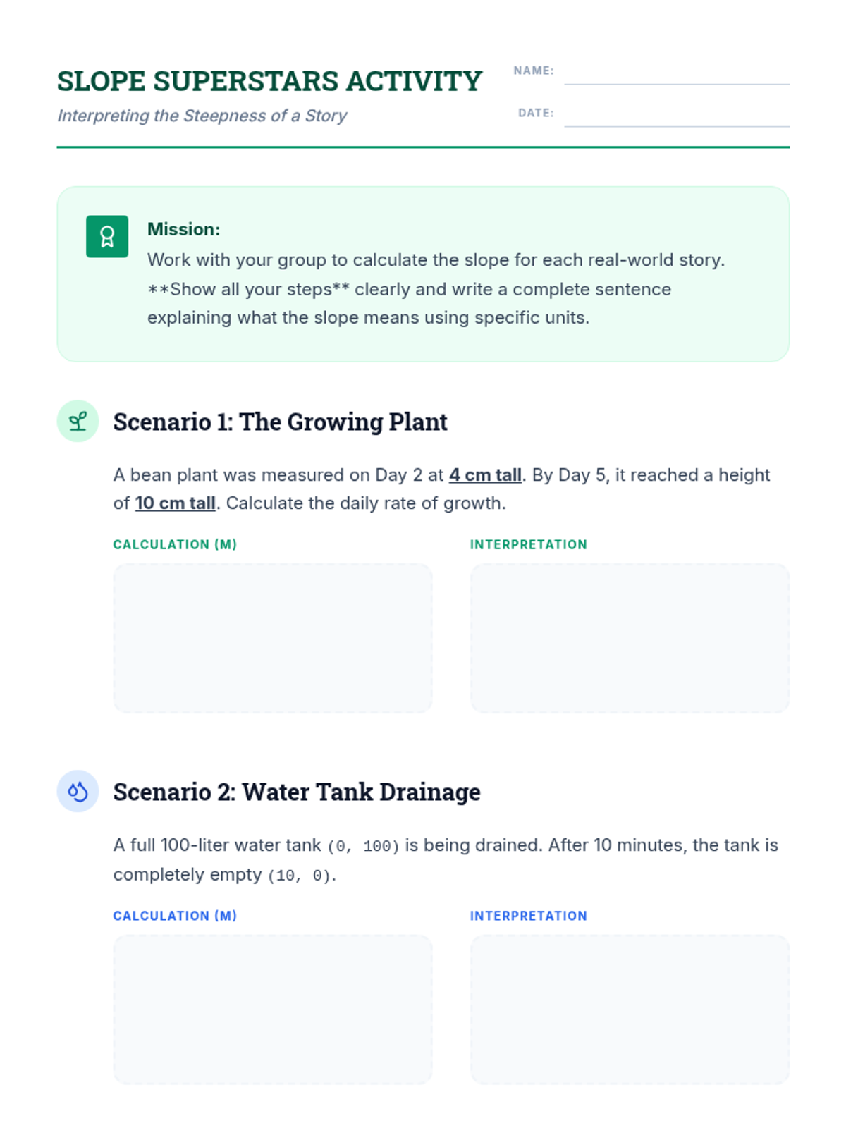 Group activity worksheet for calculating slope and rate of change from real-world scenarios, optimized for 8.5x11 printing with 1-inch margins and clear work areas.