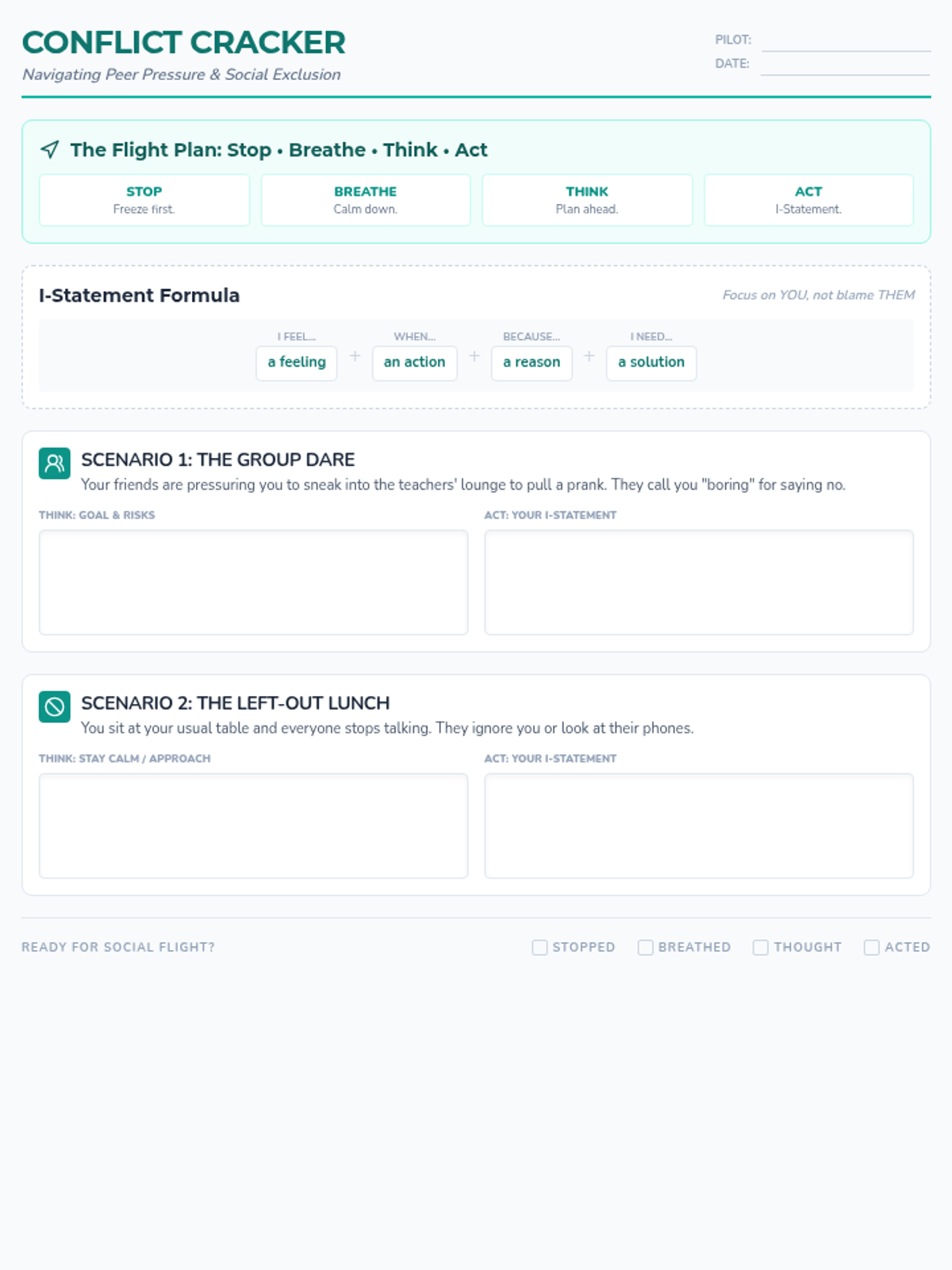 A structured worksheet for middle school students to practice conflict resolution. It features the 'Stop, Breathe, Think, Act' model and 'I-Statements' applied to peer pressure and social exclusion scenarios.