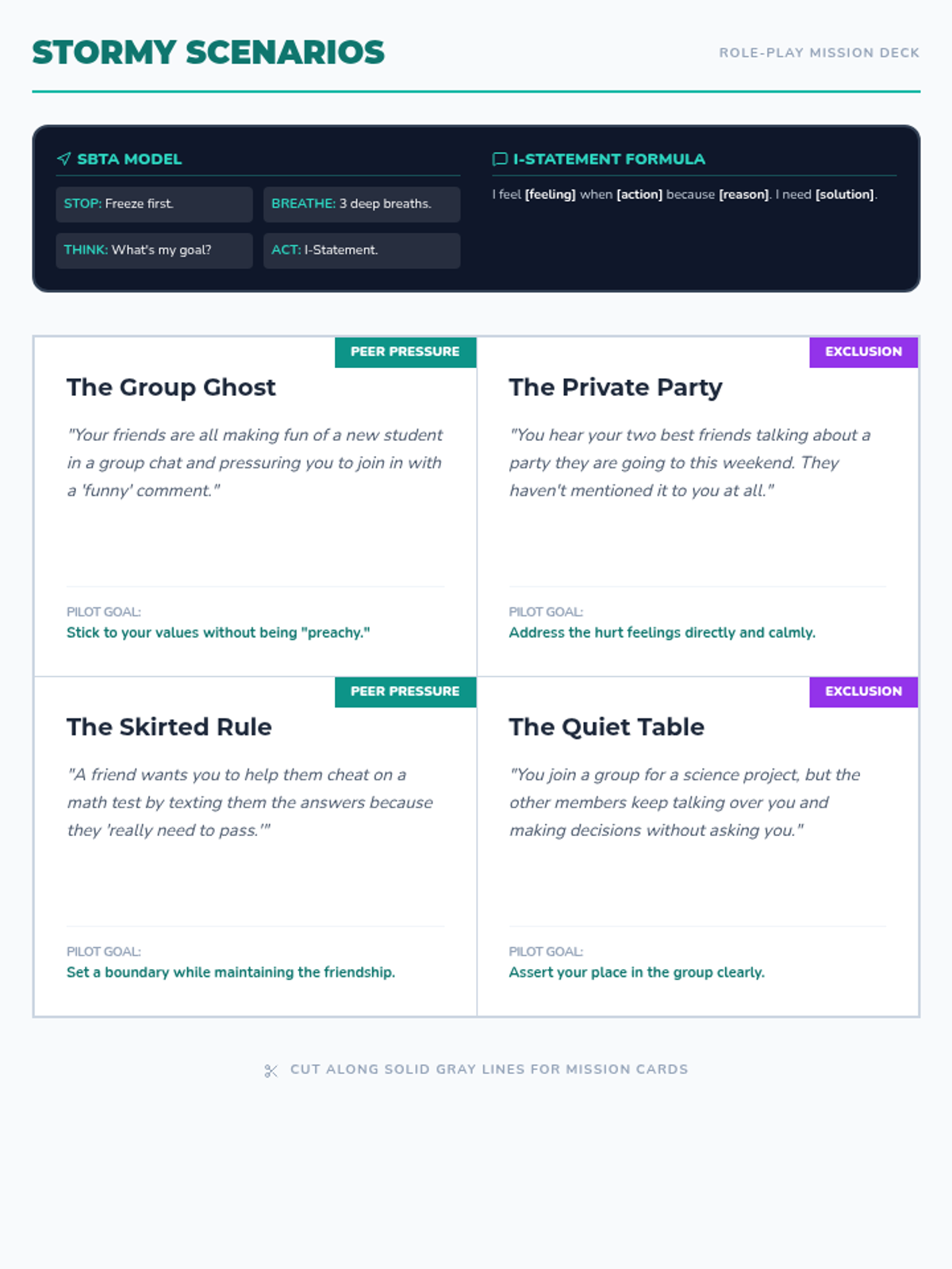 A set of printable role-play cards featuring peer pressure and social exclusion scenarios to help middle schoolers practice conflict resolution skills.