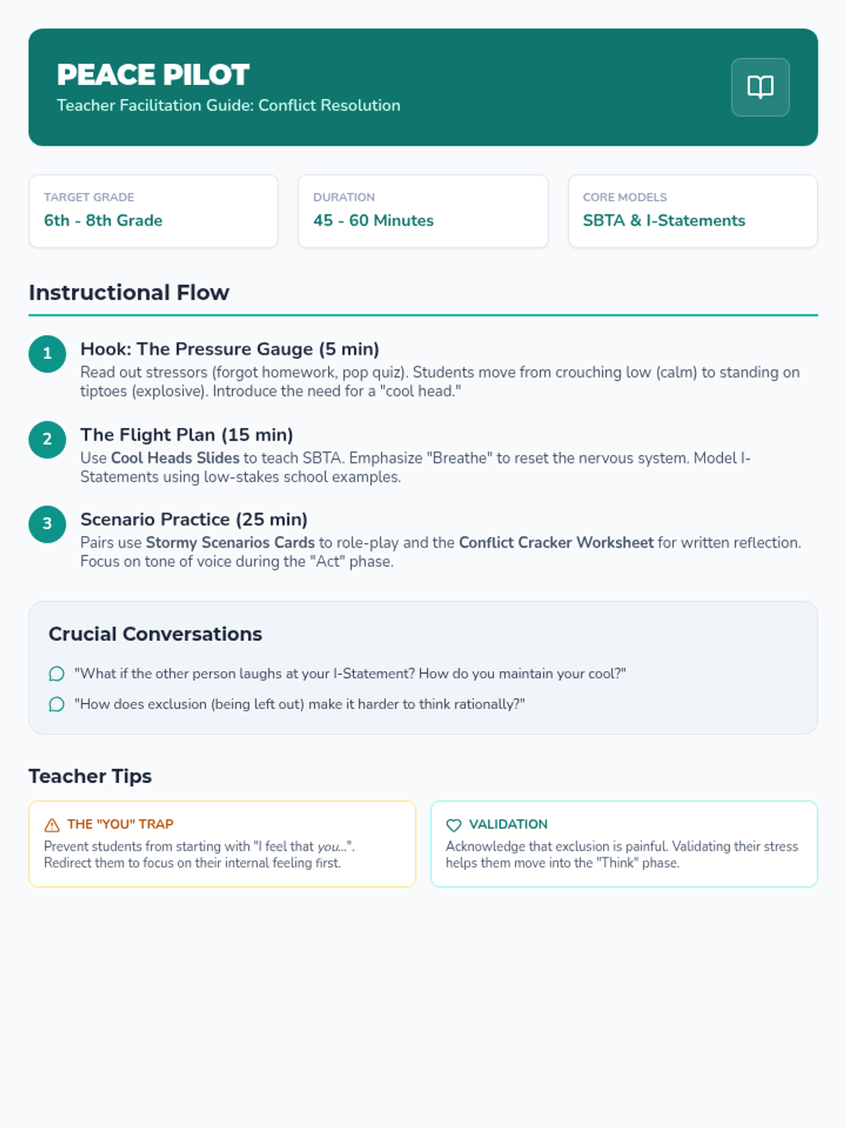 A comprehensive facilitation guide for teachers to deliver a 45-60 minute lesson on conflict resolution, featuring the SBTA model and role-play strategies.