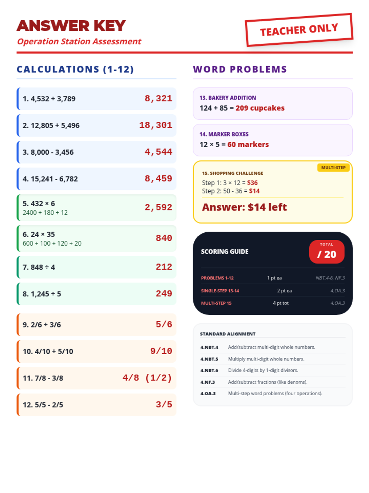 Complete answer key for the Operation Station Assessment. Includes worked-out solutions, a points breakdown, and a CCSS alignment rubric for teacher grading. Snippets for area models and multi-step word problems are included.