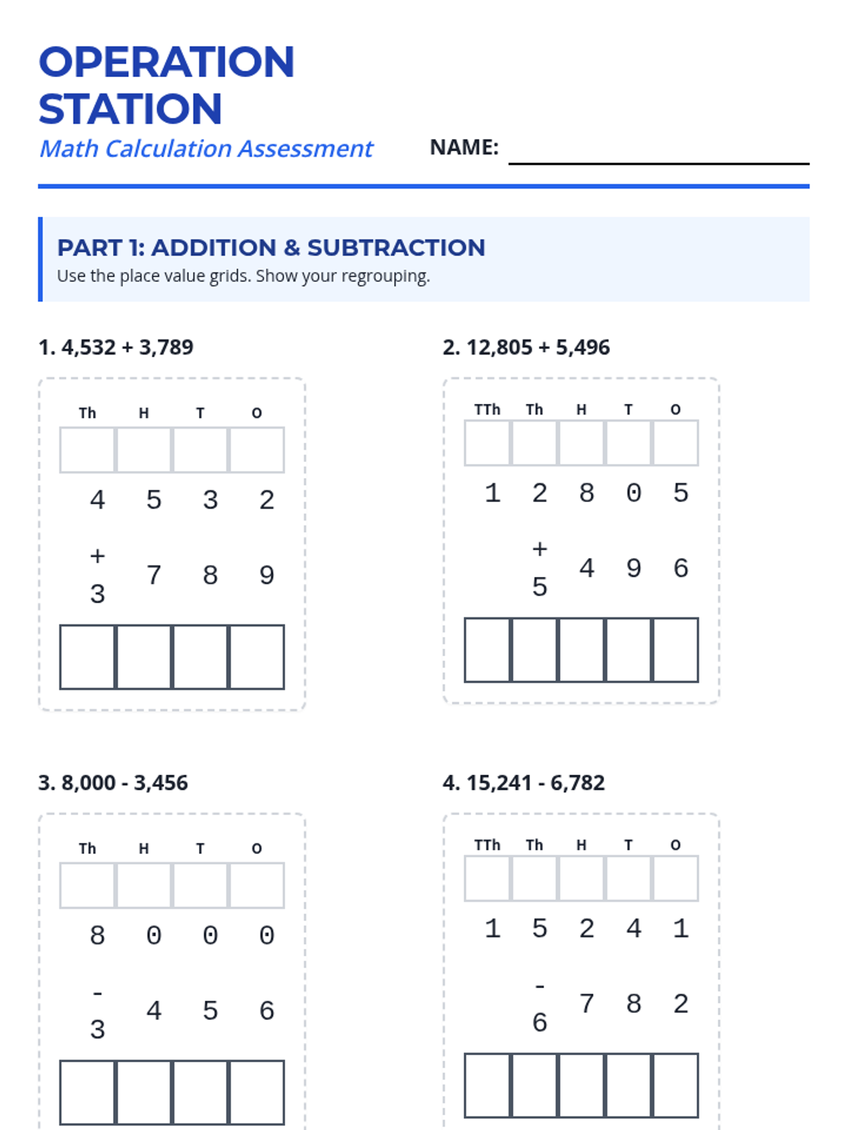 A student assessment for 4th-grade math calculations and word problems. Features large print, graphic organizers for multi-digit operations, and fraction models to support diverse learners.