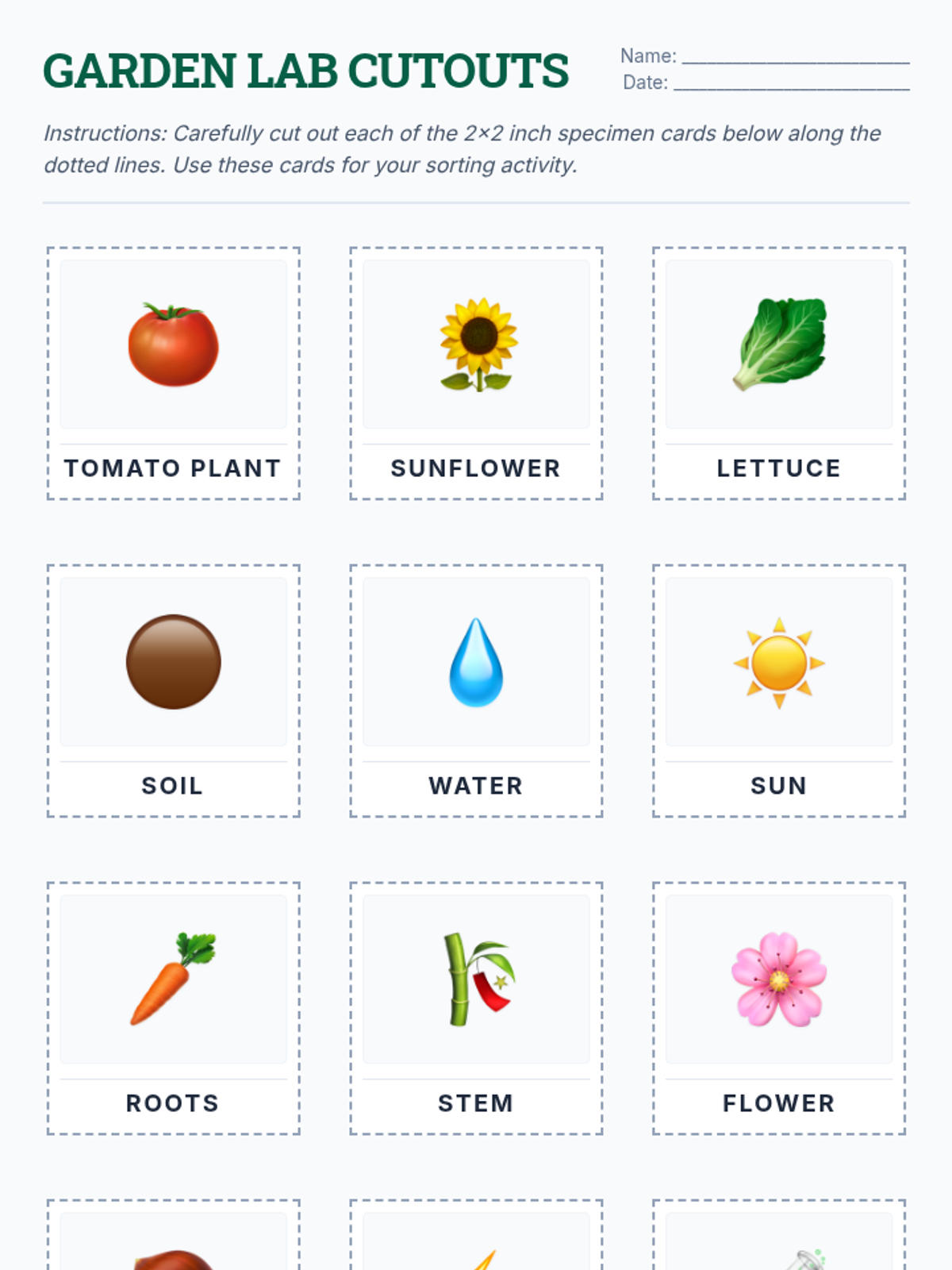 A set of 12 printable 2x2 inch cutout cards featuring plant types, parts, and needs with visual icons and labels. Designed for hands-on sorting activities.