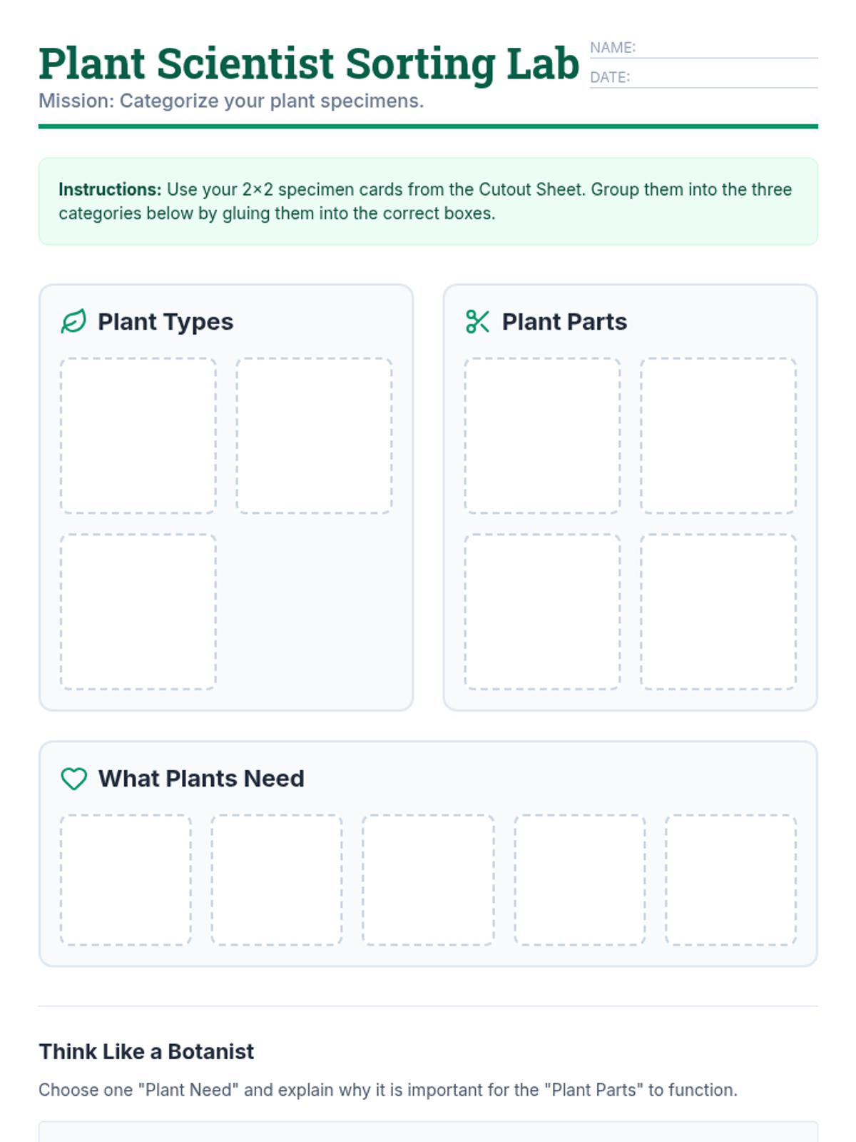 A sorting mat where students paste their plant cutout cards into three categories: Plant Types, Plant Parts, and Plant Needs. Includes a reflection question.