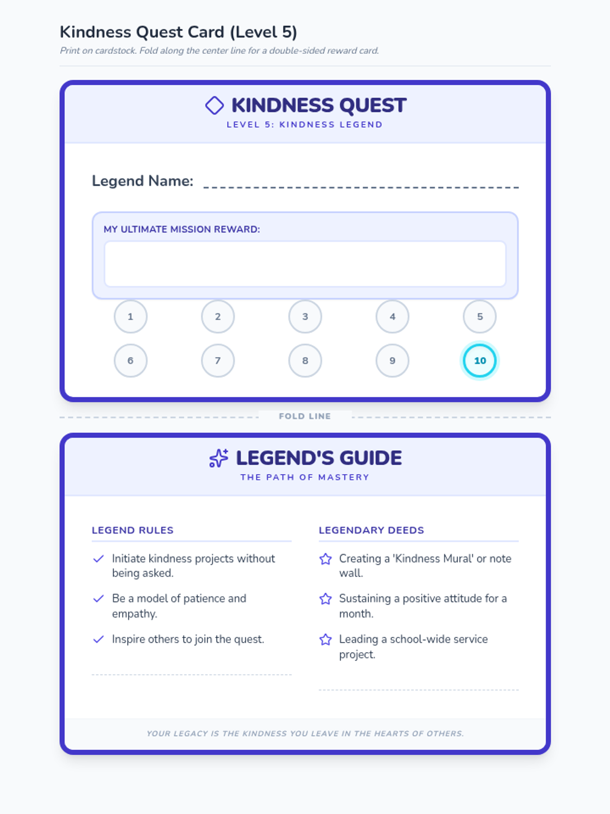 The final level of the Kindness Quest reward system, focusing on self-driven leadership and legacy. Features a deep indigo theme with legendary behavior guides.