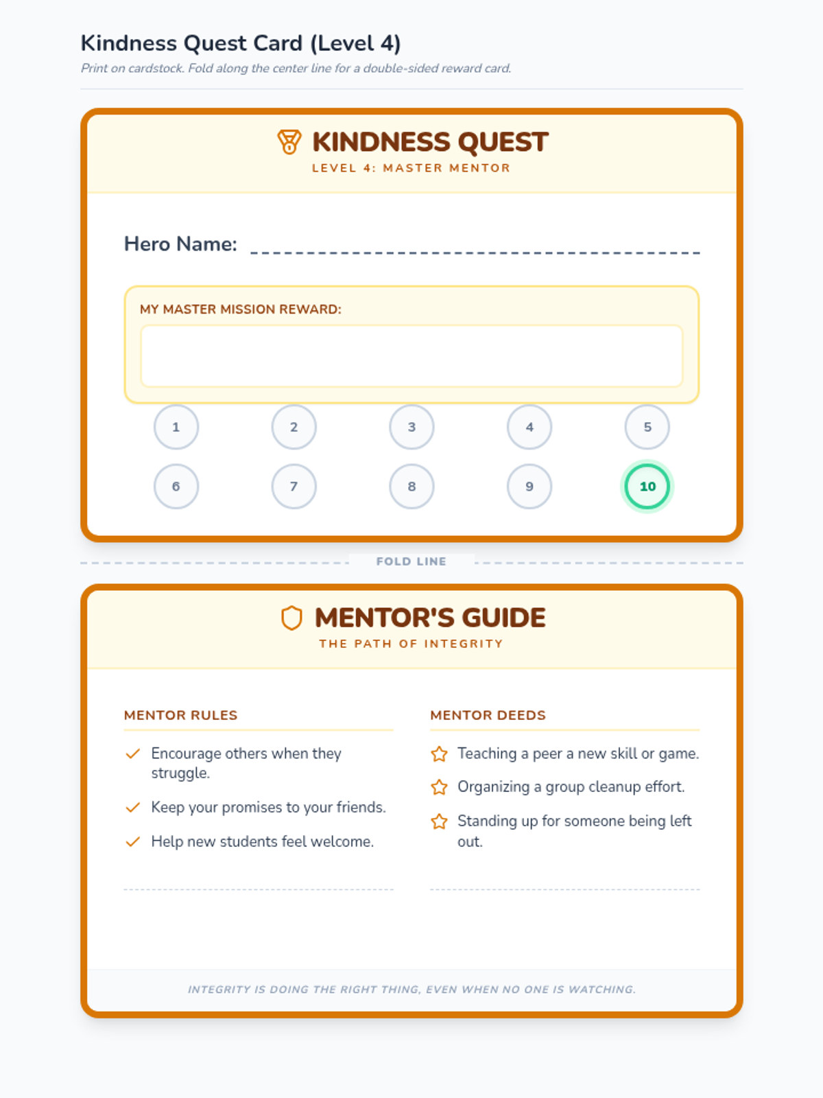 Level 4 of the Kindness Quest reward system, focusing on peer mentorship and integrity. Features an amber theme with advanced stamp slots and mentor behavior guides.