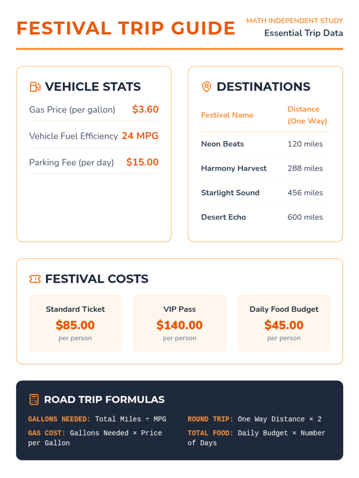 A reference sheet containing fuel prices, vehicle MPG, distances to various festivals, and ticket costs to support the task card activities.