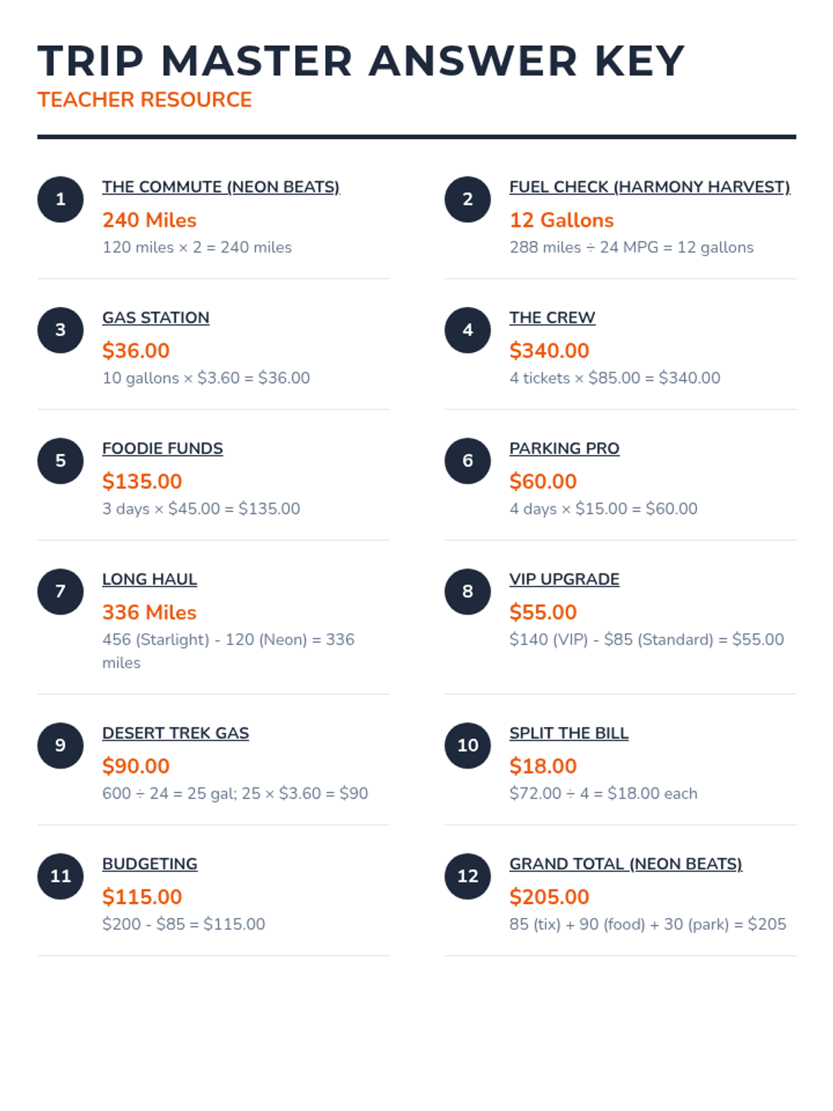 A comprehensive answer key for teachers providing solutions and mathematical breakdowns for all 12 festival road trip task cards.