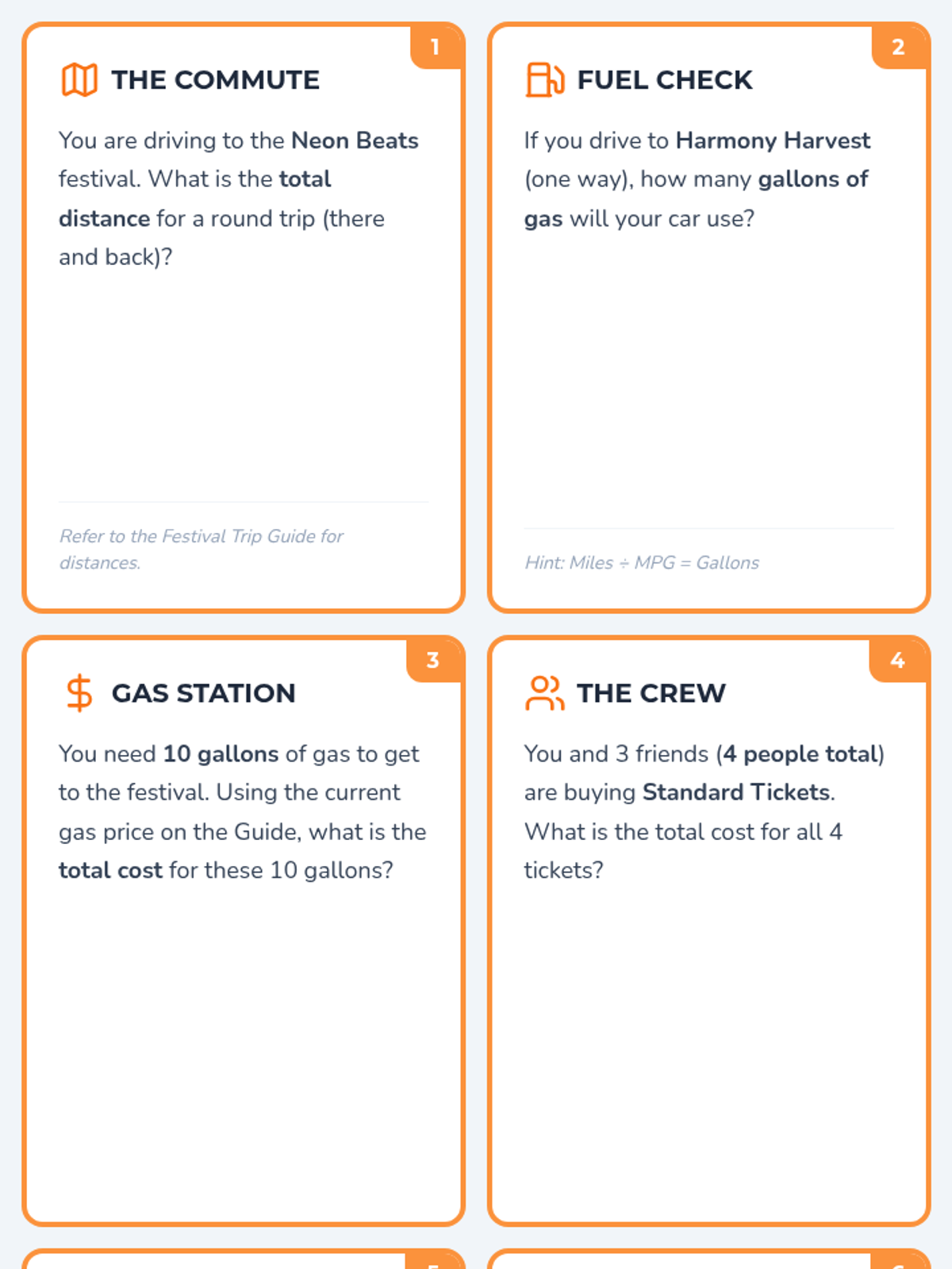 A set of 12 task cards focusing on mileage, fuel consumption, budgeting, and cost sharing for a festival road trip.