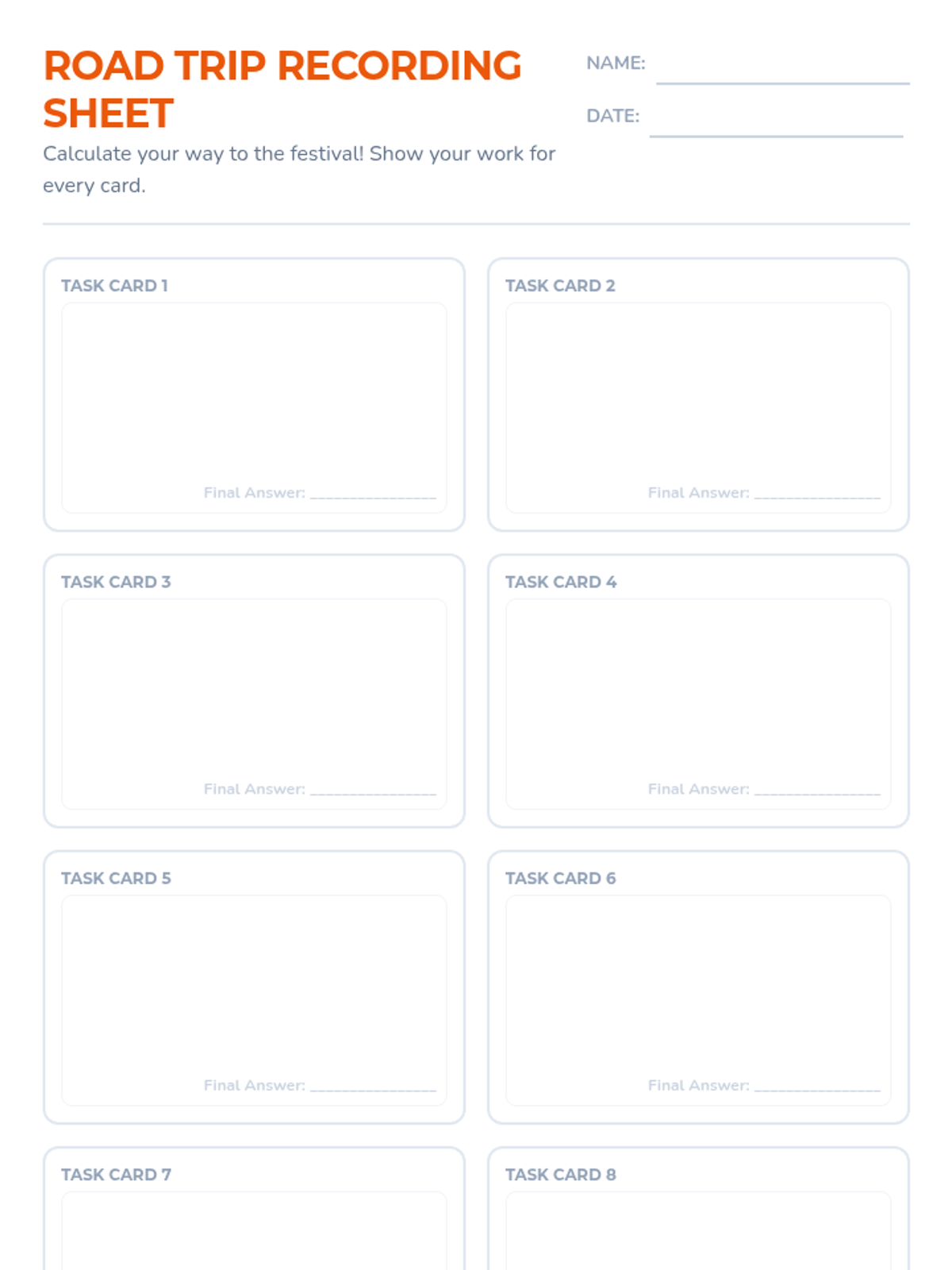 A recording sheet for students to document their mathematical work and final answers for the Festival Trip task cards.