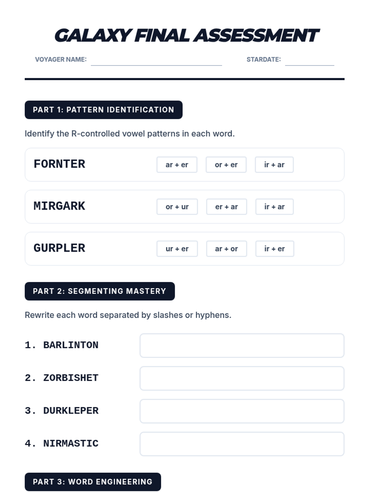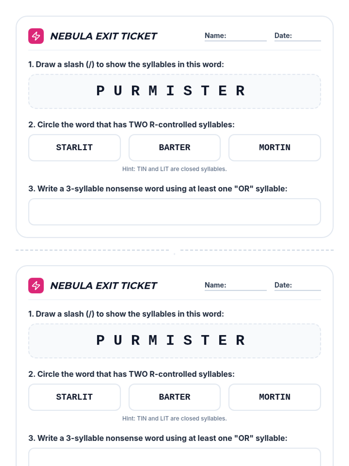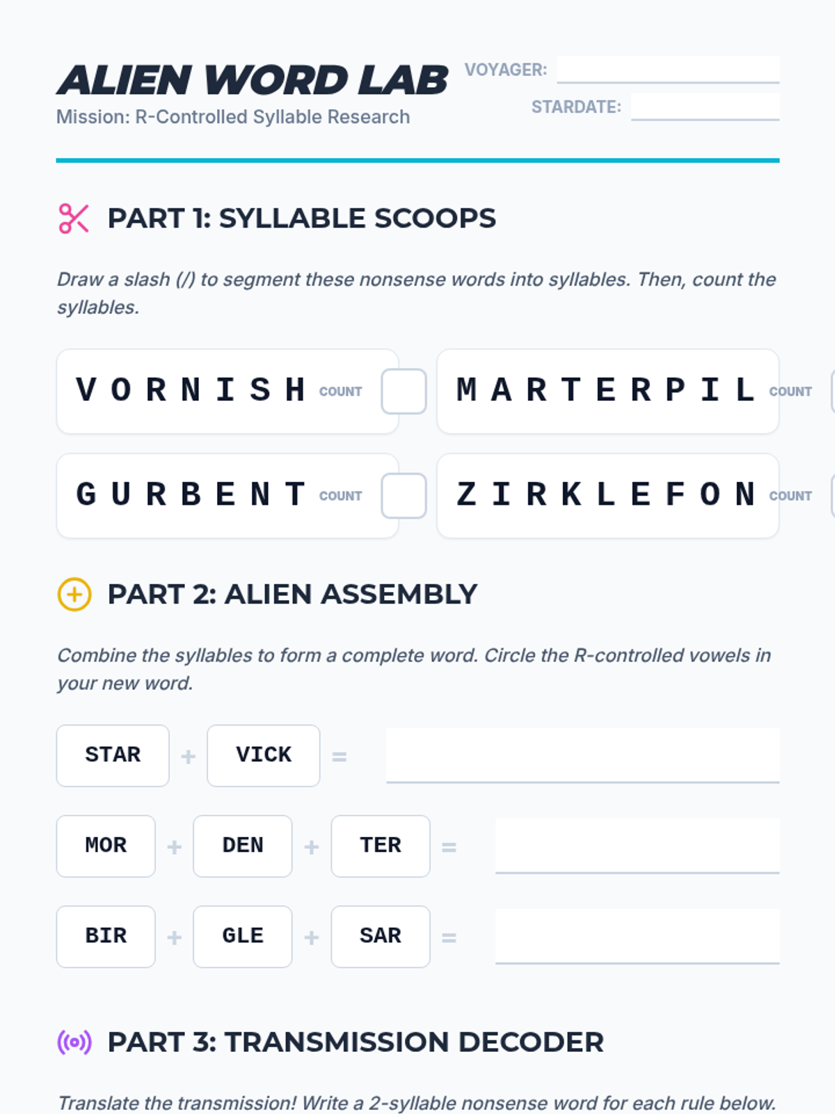 A quick, two-per-page assessment tool for checking student understanding of segmenting and building multisyllabic R-controlled nonsense words.