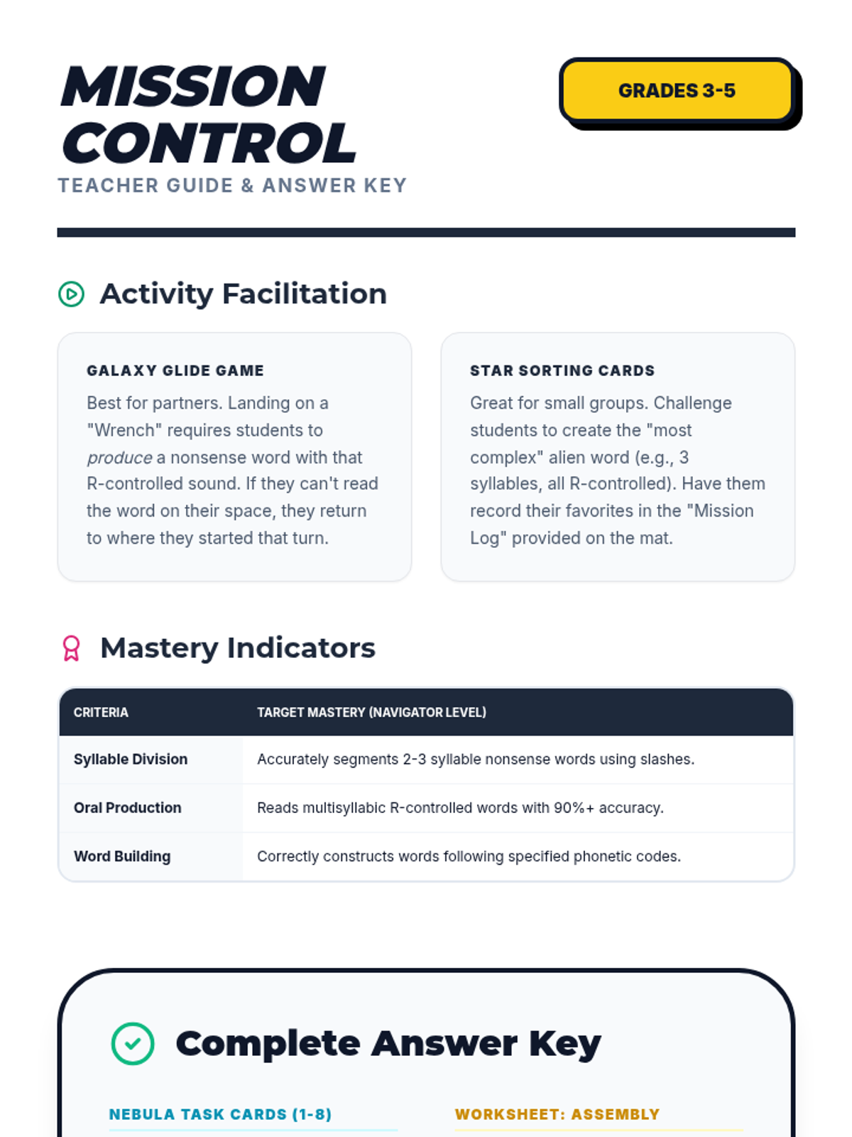 A comprehensive teacher resource containing instructional strategies, differentiation tips, and complete answer keys for the student worksheets and assessments in the Nonsense Nebula lesson.