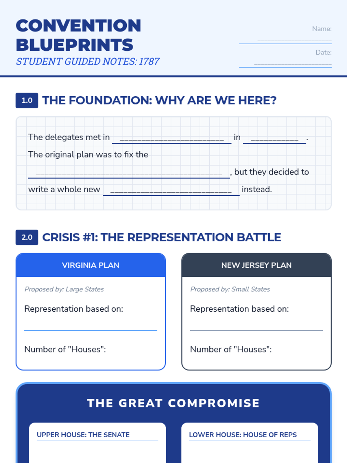 Student guided notes and graphic organizer for the Constitutional Convention. Designed to match the 'Convention Blueprints' slides with fill-in-the-blank sections and visual organizers.