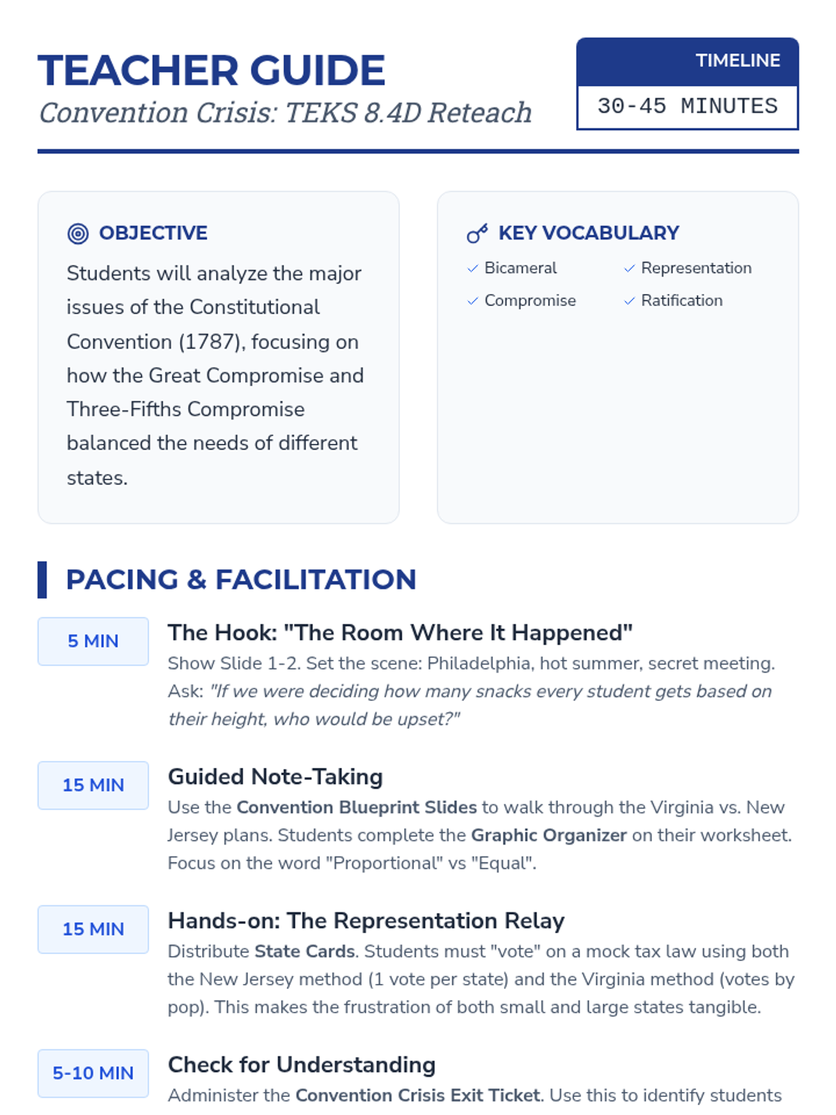 A detailed facilitation guide for teachers to lead a 30-45 minute reteach session on the Constitutional Convention, including pacing, strategies, and key focus areas.