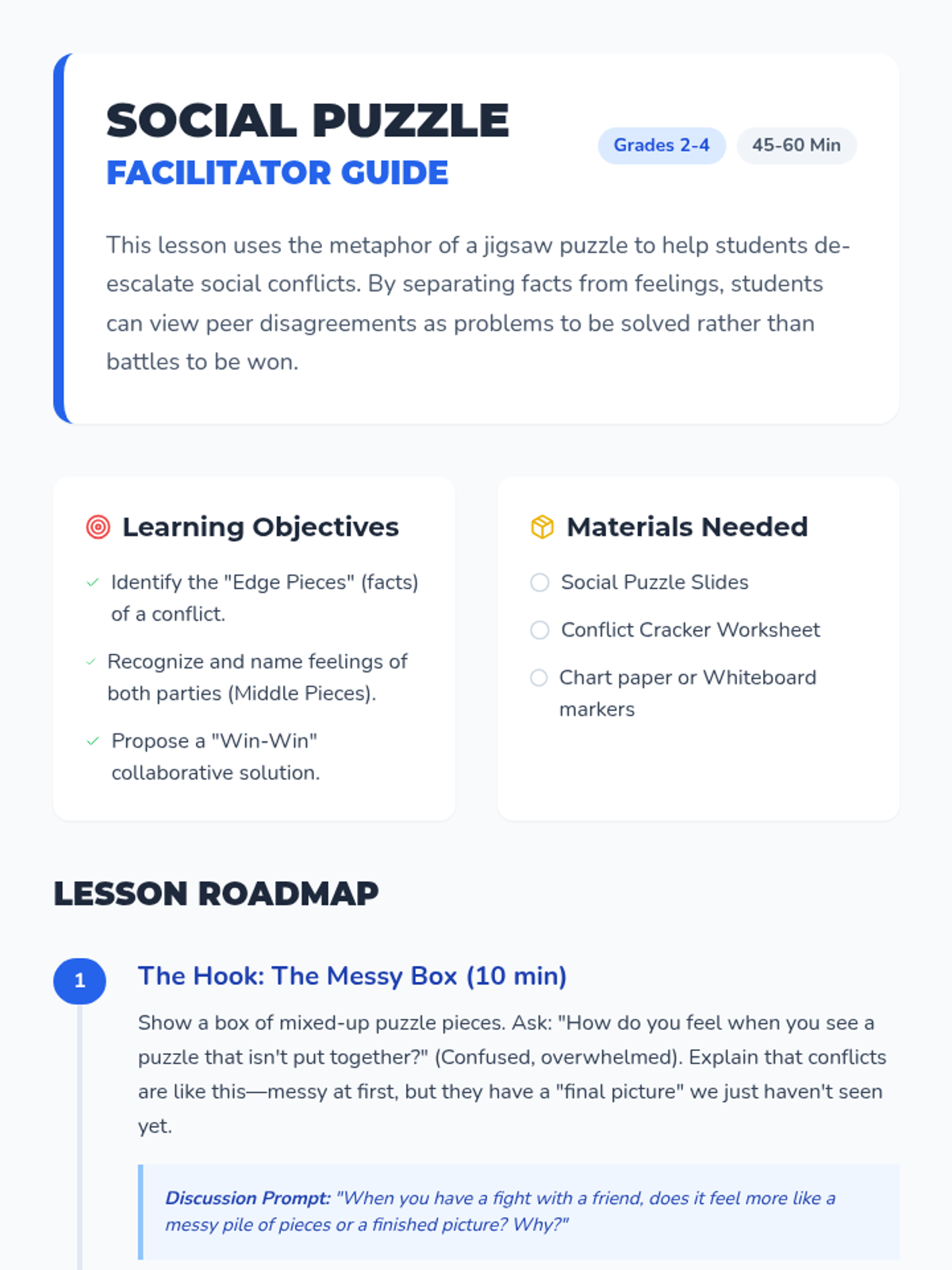 A comprehensive teacher guide for facilitating the "Social Puzzle Solvers" lesson. It includes a lesson roadmap, discussion prompts, classroom tips, and specific instructions for using the accompanying slides and worksheet.