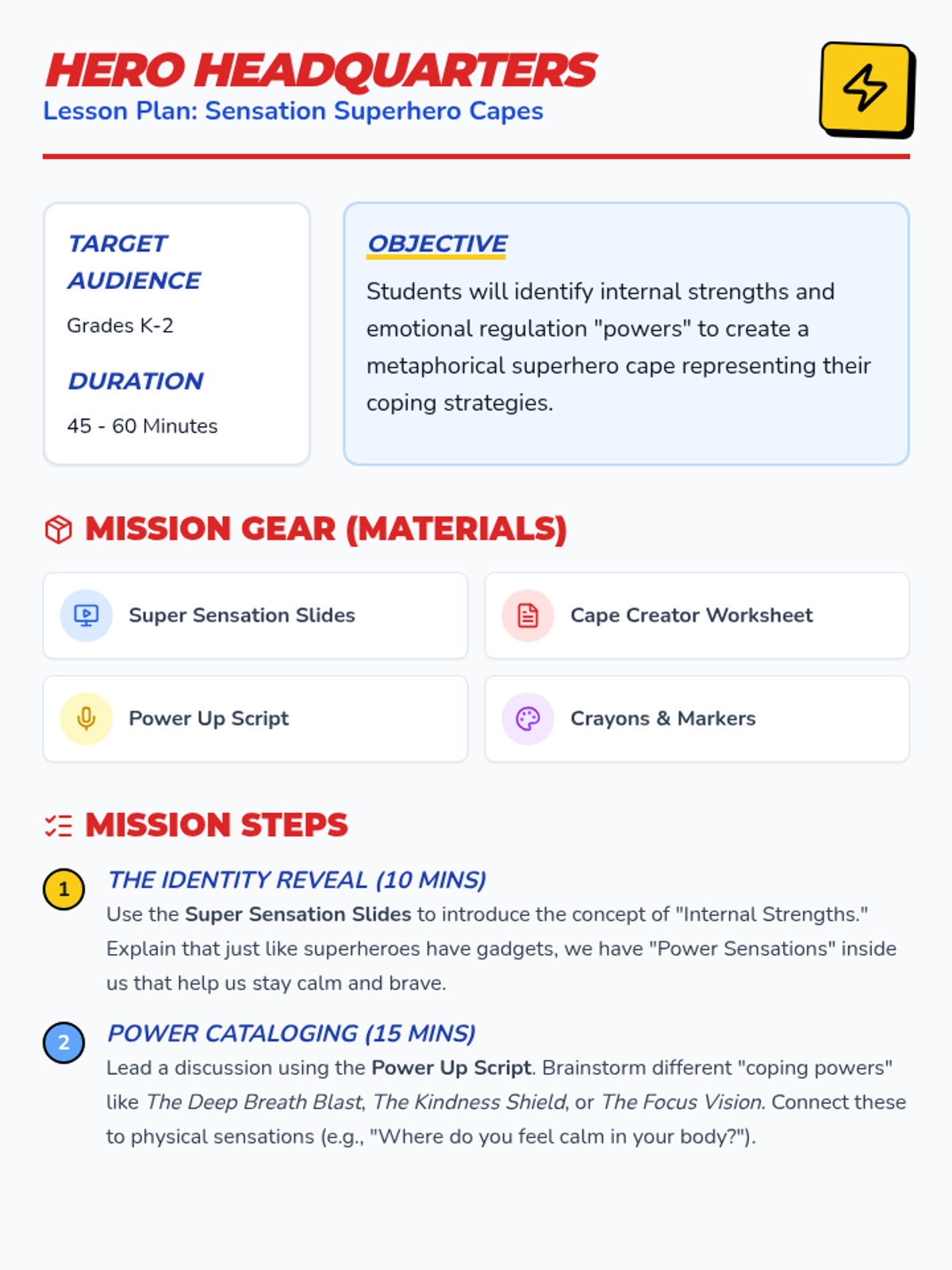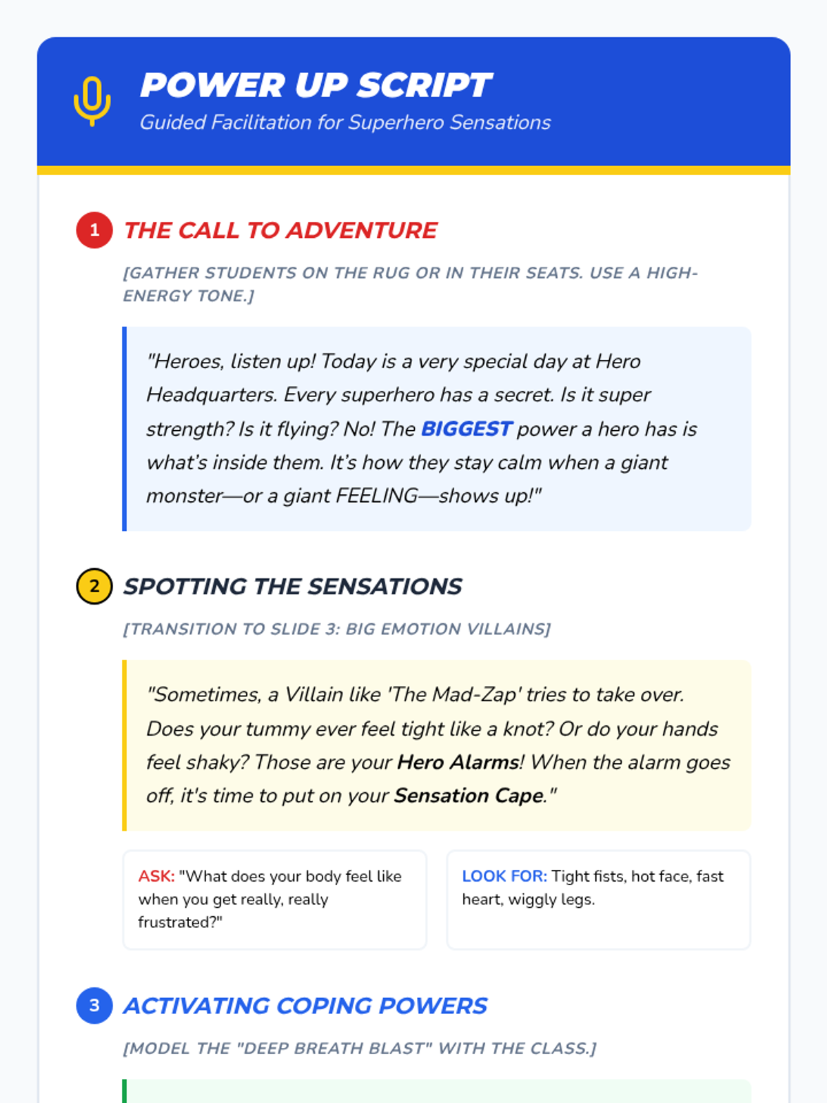 A teacher's facilitation script with prompts, discussion questions, and guided practice for leading the Sensation Superhero Capes lesson.