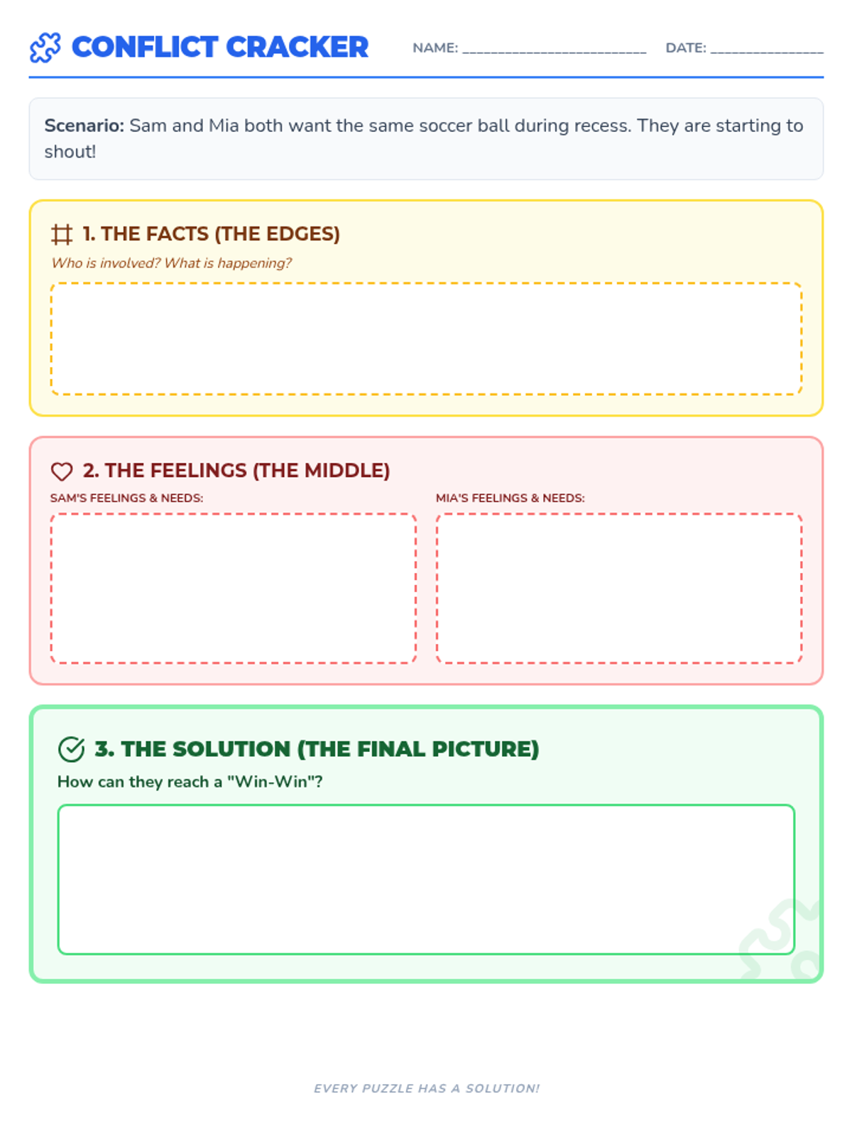 A student worksheet for identifying facts, feelings, and solutions in a social conflict. It uses a structured puzzle-themed layout to guide students through the problem-solving process.