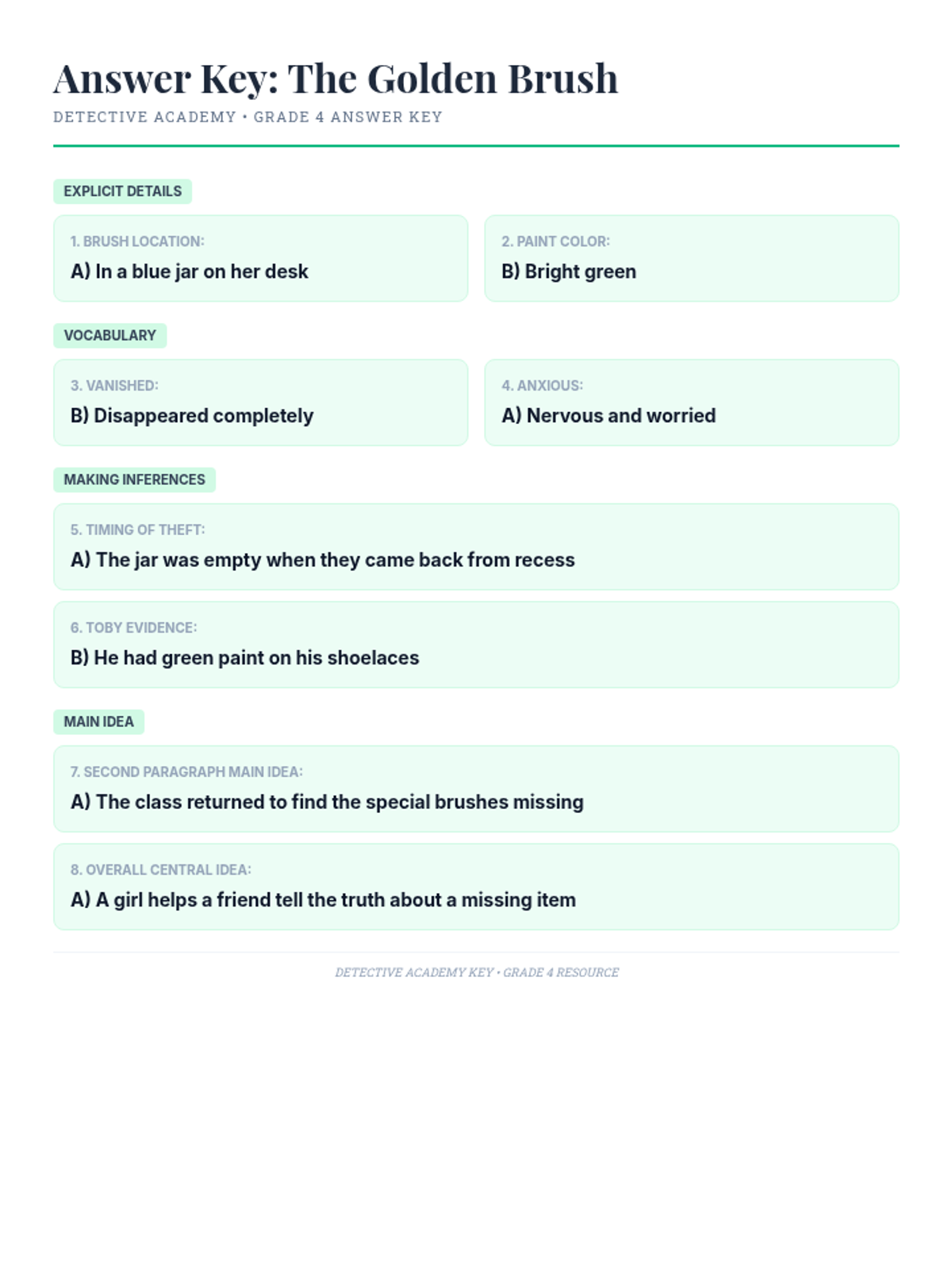 The answer key for the grade 4 "Golden Brush Mystery" worksheet, providing correct responses for multiple-choice questions.