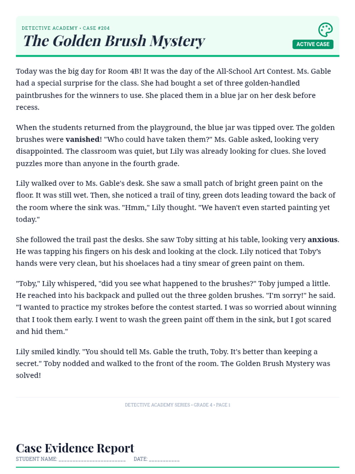 A grade 4 mystery reading passage and multiple-choice worksheet about a missing set of golden paintbrushes, targeting inference, details, vocabulary, and main idea.