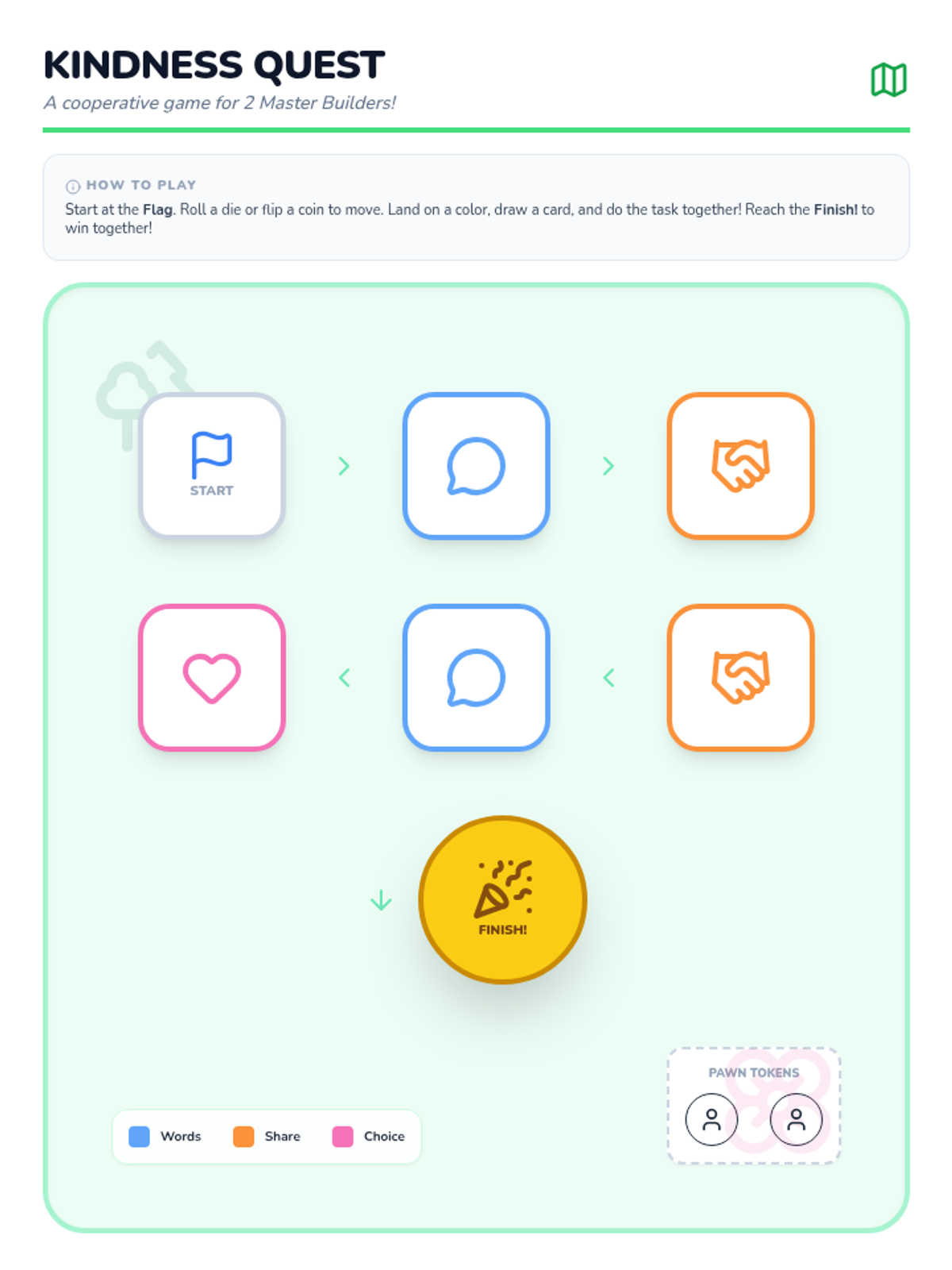 A cooperative board game for two students to play together. Includes a printable game board and task cards that prompt students to use kind words, perform sharing tasks, and celebrate their friendship.