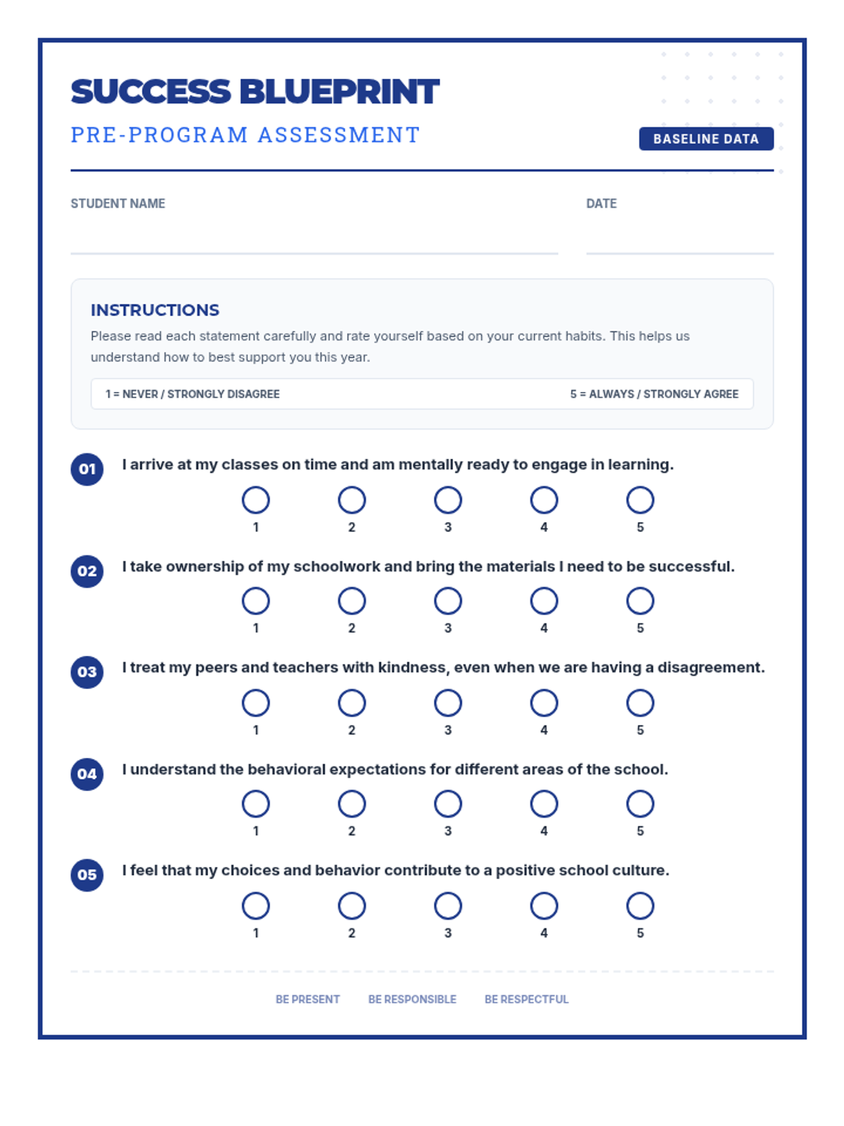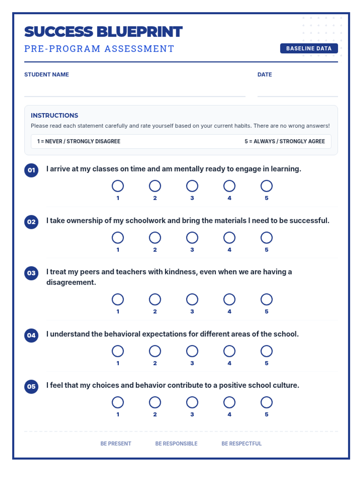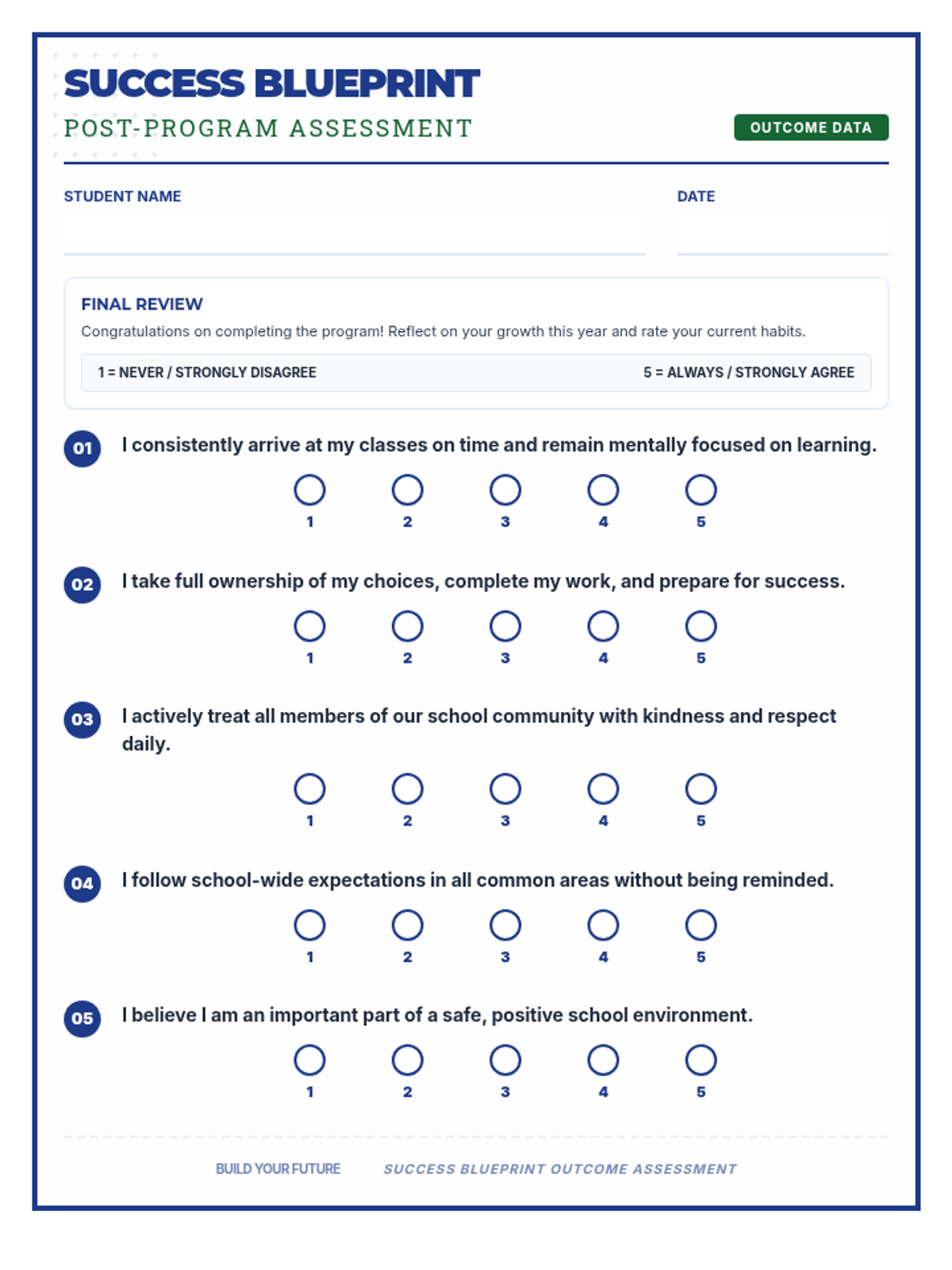 A 5-question post-assessment for students to measure their growth in being present, responsible, and respectful at the end of the program. Corrected page breaks and standardized colors.