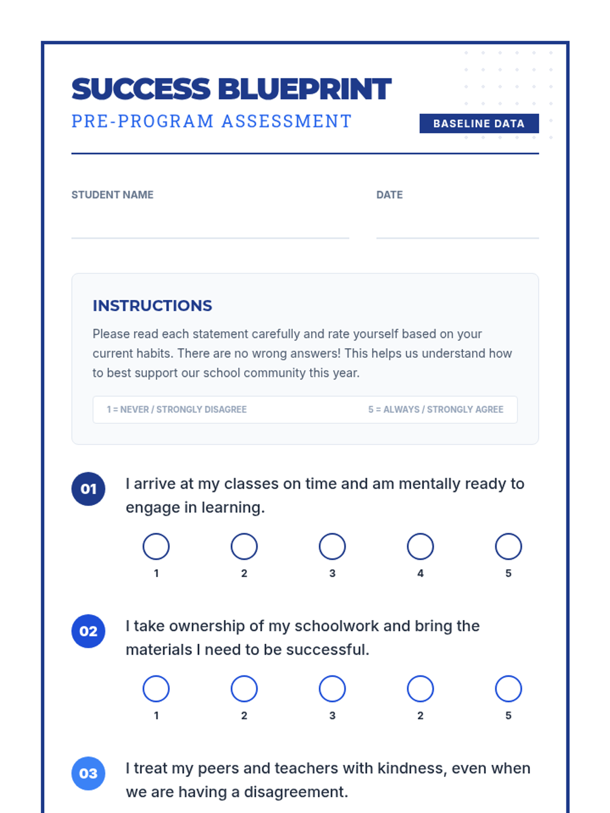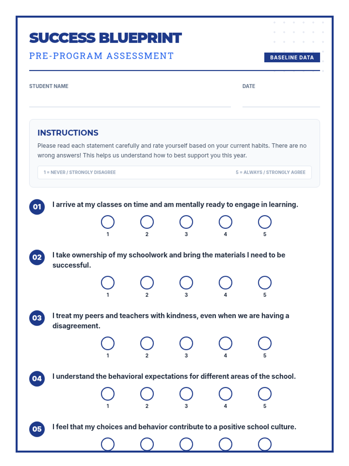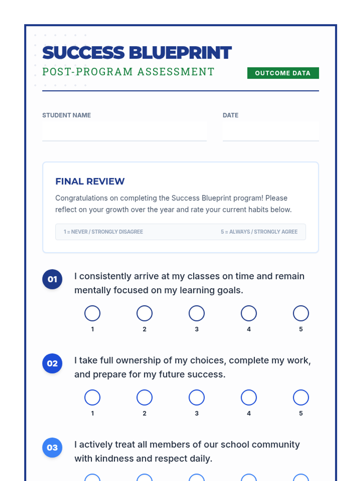 A 5-question post-assessment for students to measure their growth in being present, responsible, and respectful at the end of the program. Corrected page breaks and standardized colors.