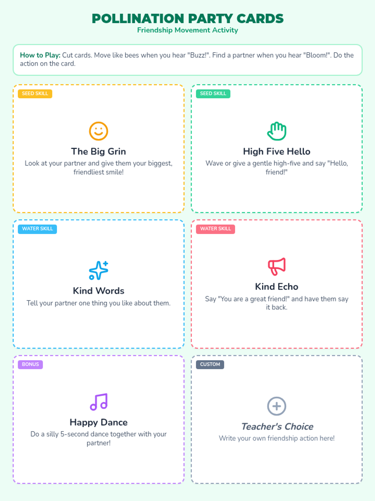 A set of printable movement activity cards for the 'Pollination Party' game. These cards guide K-2 students through physical and verbal interactions to practice making and keeping friends.