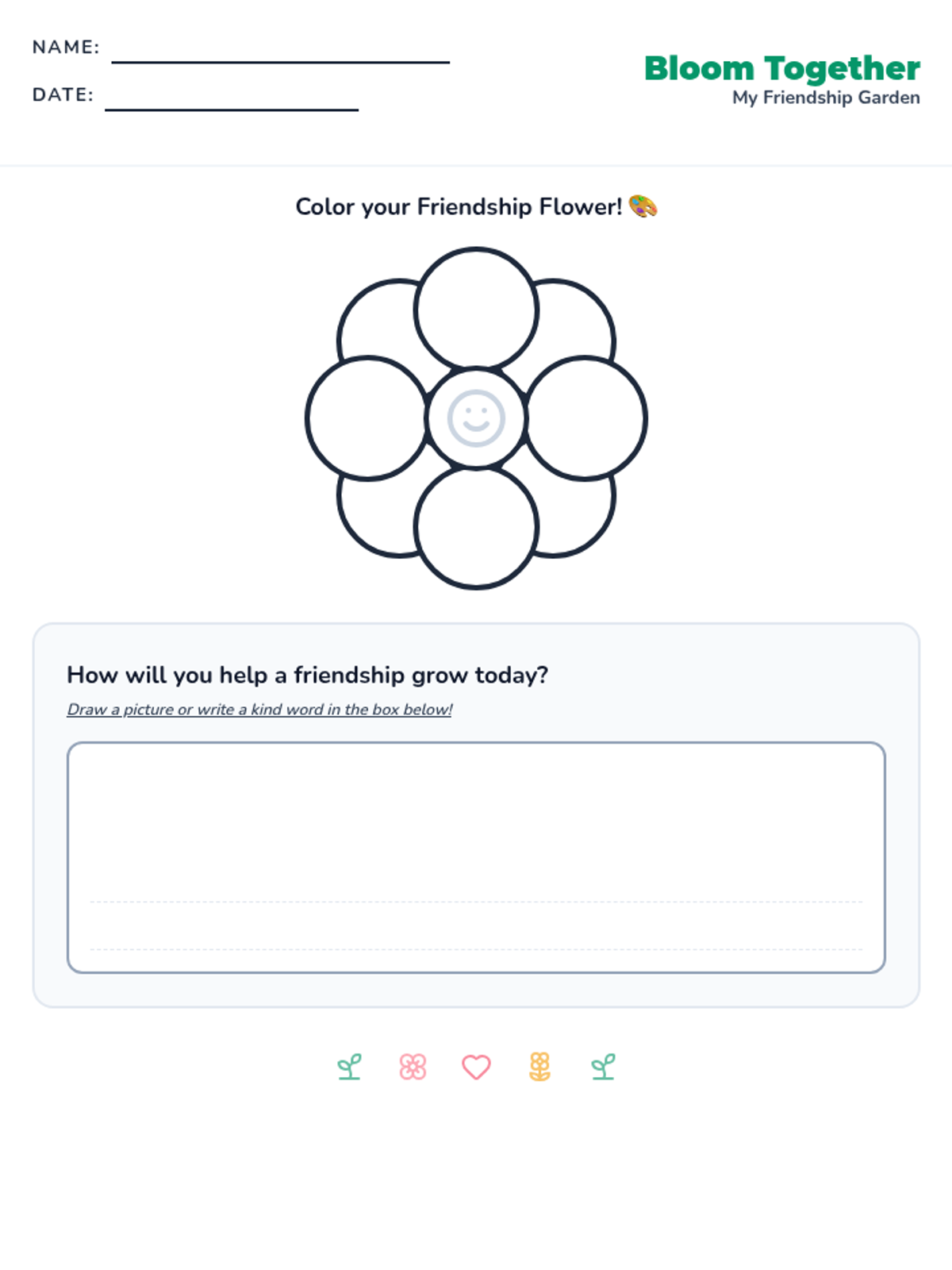 A combined worksheet and coloring page for K-2 students. It features a large flower to color and a reflection area where students can draw or write about how they will be a good friend.