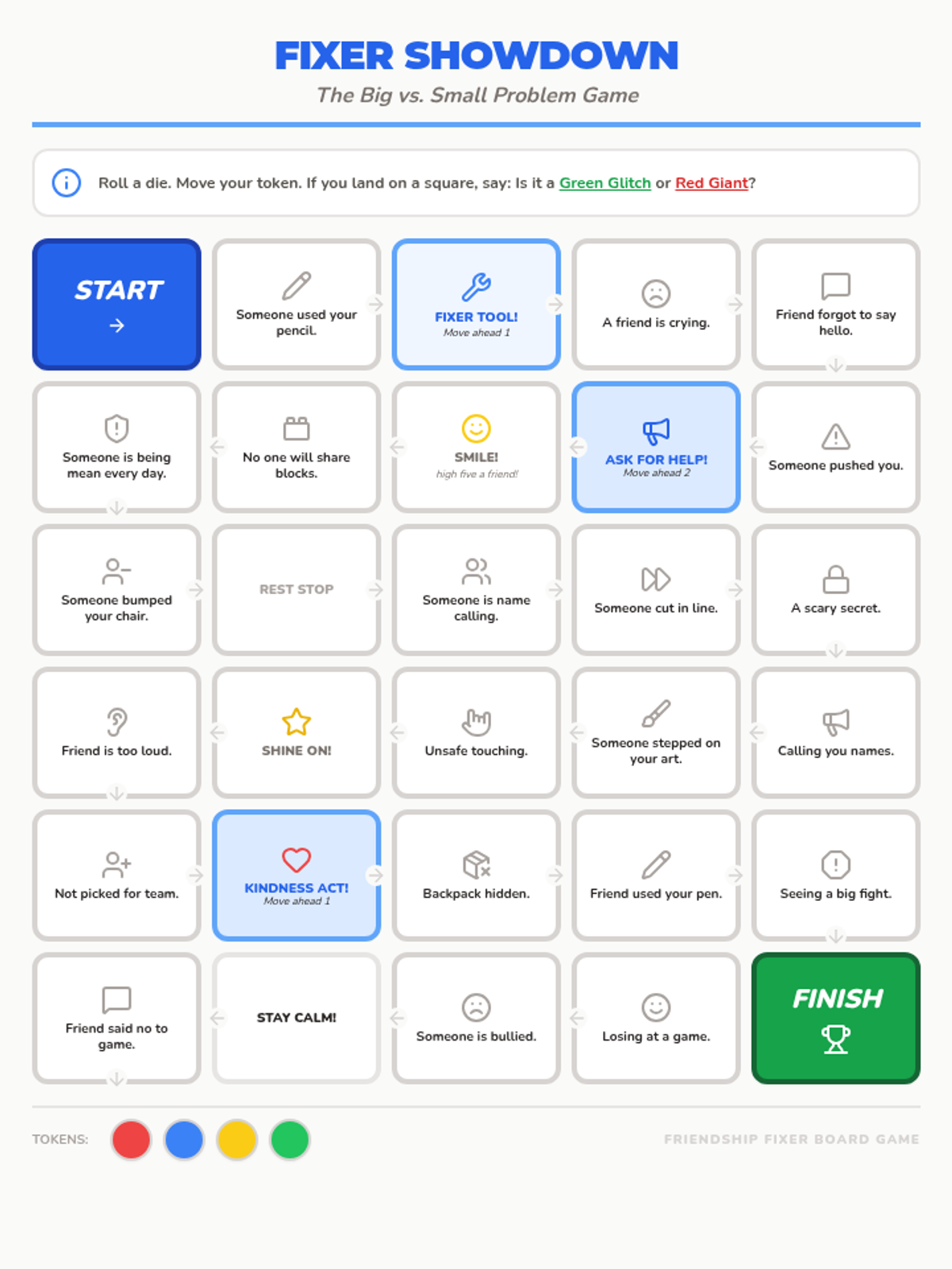A printable board game for K-2 students to practice distinguishing between Glitch (small) and Giant (big) friendship problems. Now includes bold orange chevron path indicators and neutral problem squares for active learning.
