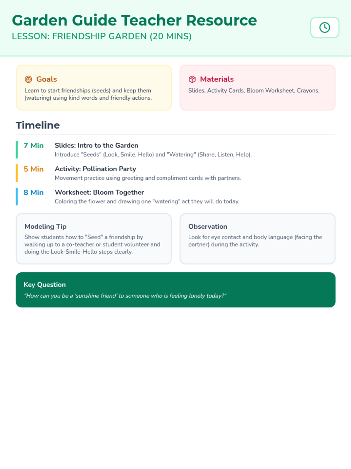 A comprehensive teacher's guide for the 20-minute Friendship Garden lesson, including learning objectives, a timed breakdown, and facilitation tips for K-2 students.
