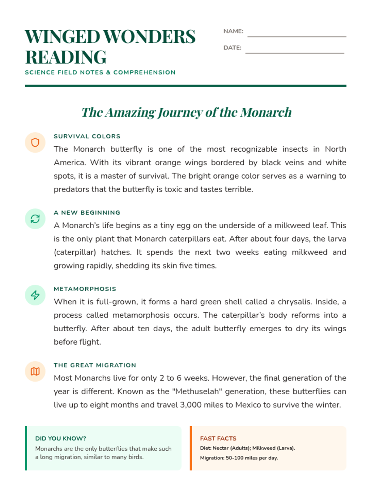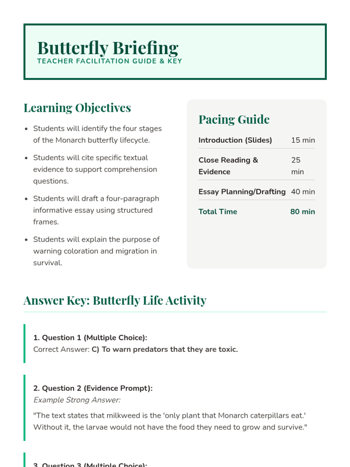A comprehensive teacher guide for the Winged Wonders lesson, including learning objectives, pacing, answer keys, and a rubric for the informative essay.
