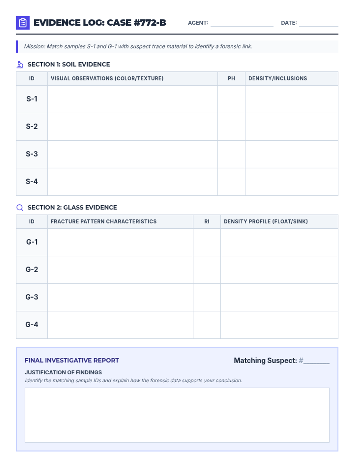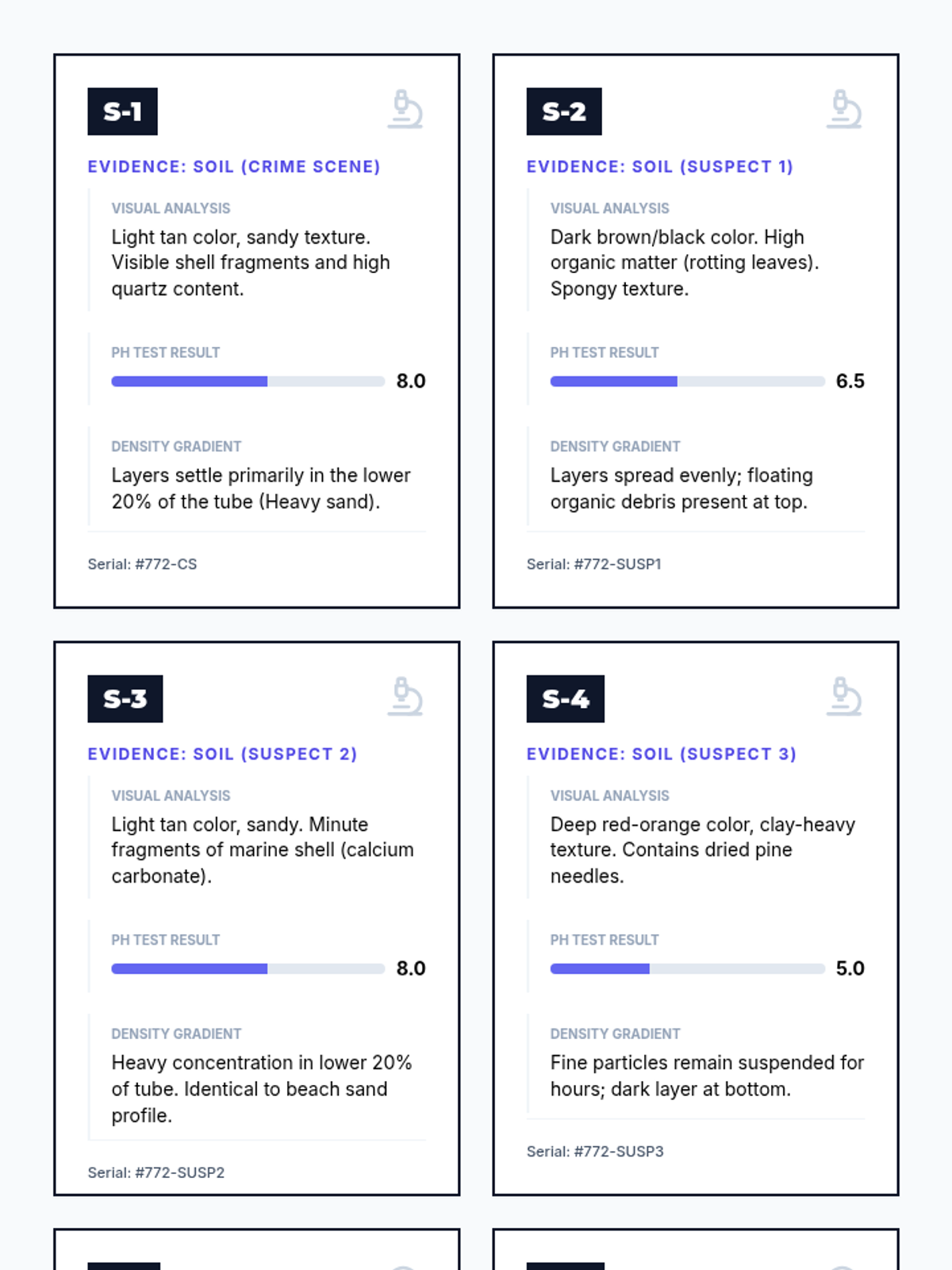 Set of 8 scavenger hunt station cards (4 soil samples, 4 glass samples) containing forensic data for students to analyze and compare. Standardized UI elements for neutrality.
