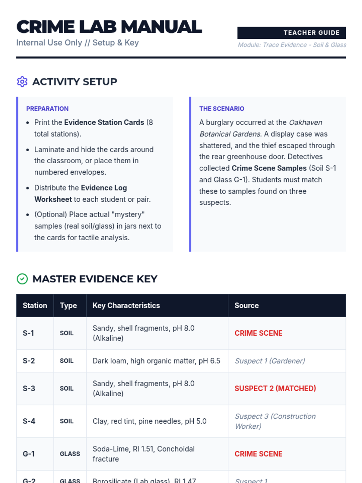 Comprehensive teacher guide and answer key for the Shattered Secrets glass evidence scavenger hunt. Revised to fix page breaks, clarify SVG labels, and ensure consistent layout. Content consolidated to fit 2 pages efficiently.