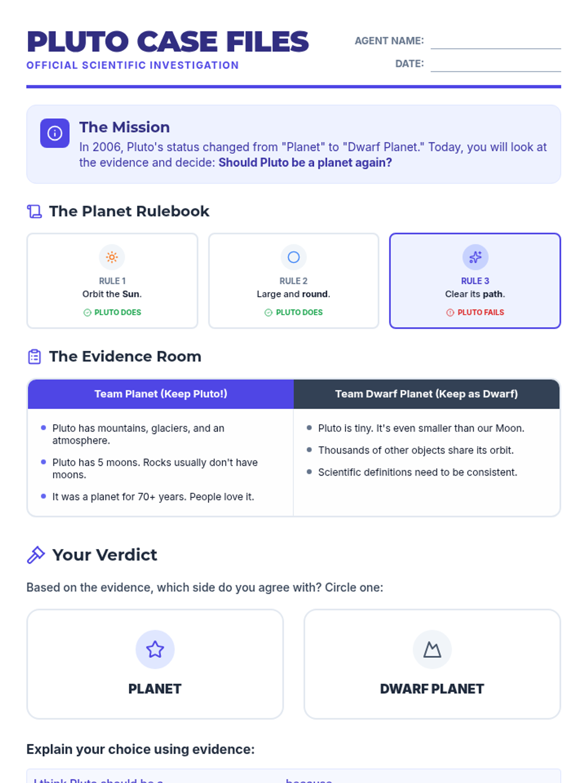 A structured worksheet for 9th-10th grade special education students exploring the scientific debate over Pluto's status as a planet, featuring simplified IAU definitions and pro/con arguments.