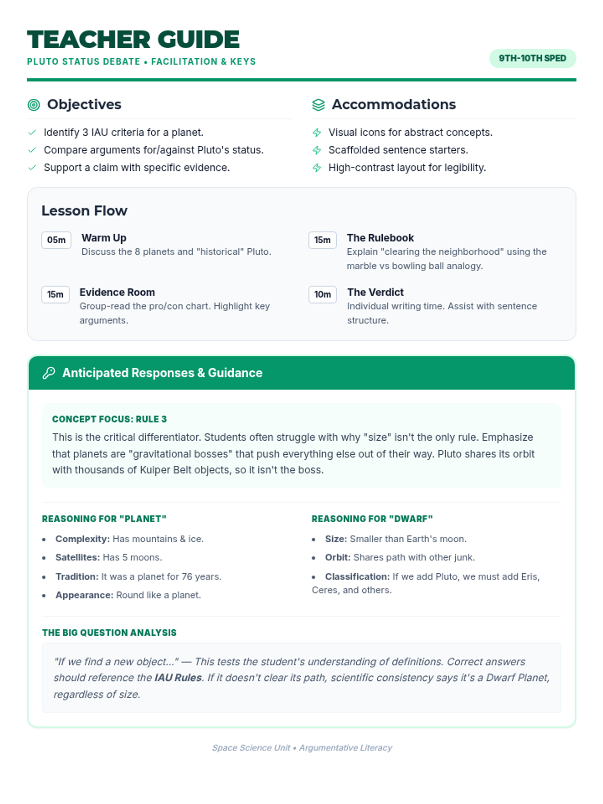 A teacher guide for the Pluto Status Debate lesson, including instructional goals, SpEd-specific accommodations, pacing suggestions, and an answer key for expected student responses.