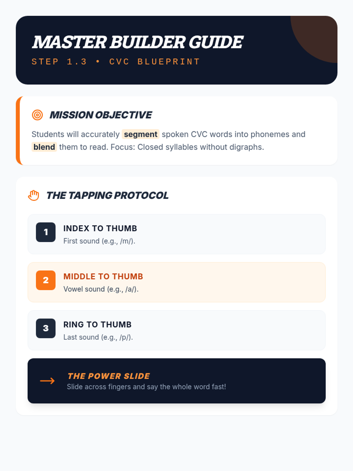 Teacher guide for Step 1.3 CVC instruction, featuring a clear 'tapping protocol' breakdown, troubleshooting tips for schwa sounds and vowel confusion, and a curated word bank.