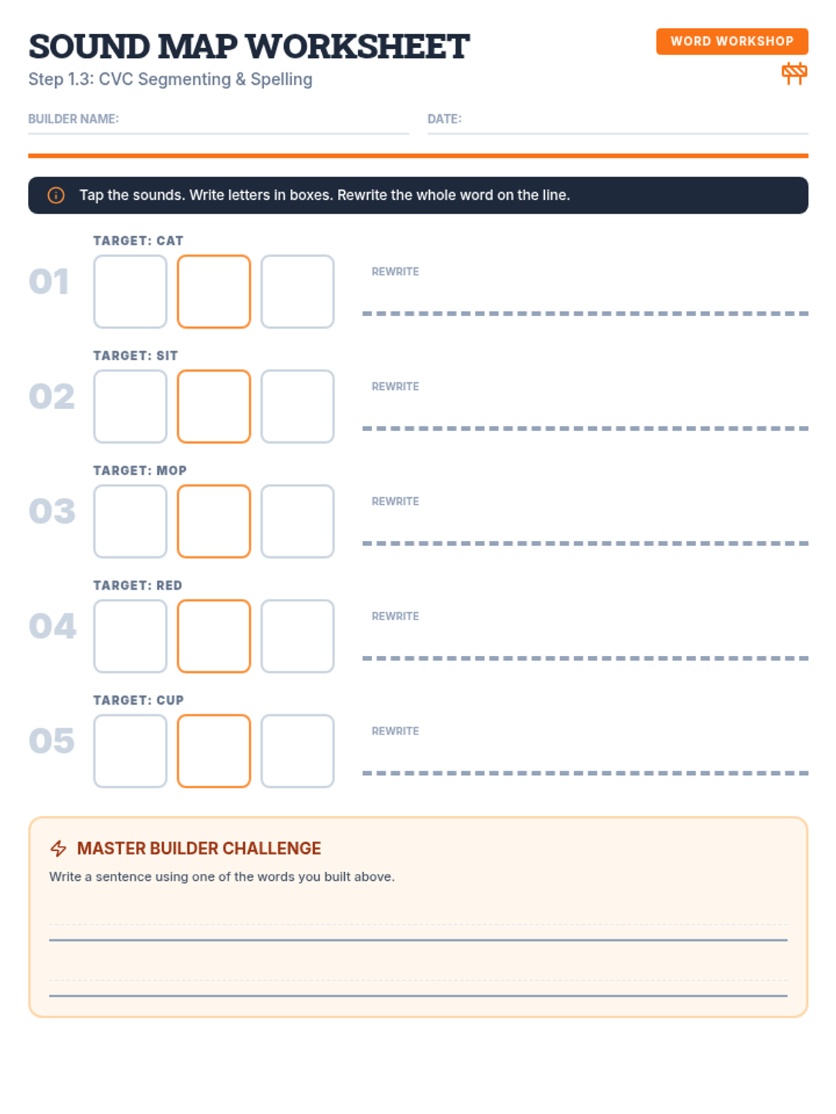A sound mapping worksheet for Step 1.3 (CVC), featuring distinct boxes for segmenting phonemes and writing graphemes. The middle box is highlighted in orange to represent the vowel.