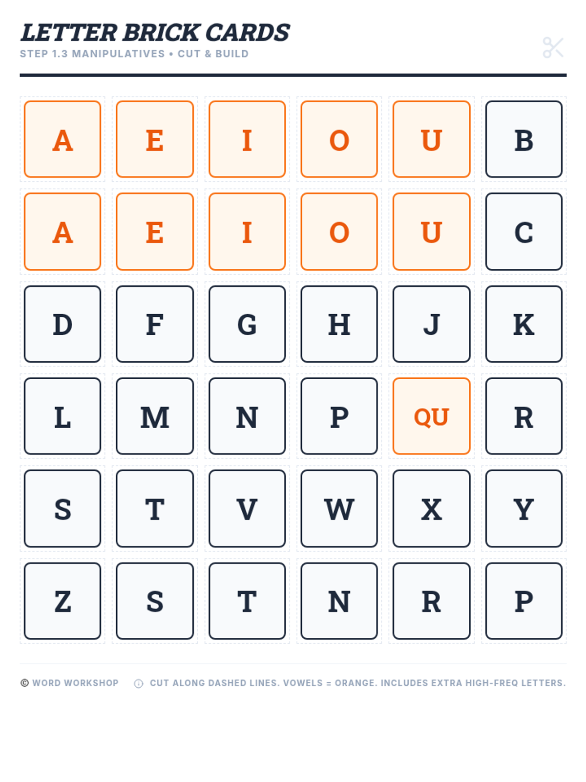Printable letter brick cards for building CVC words. Vowels are orange and consonants are dark grey/black, following phonics color-coding standards. Large fonts ensure visibility for young learners.